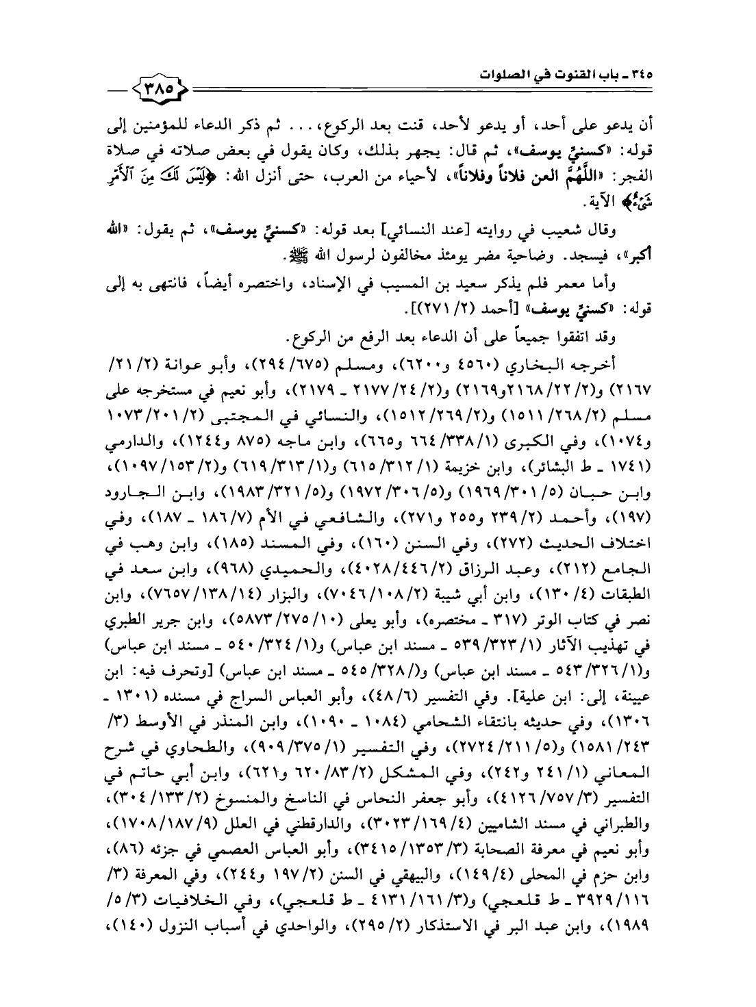أن يدعو على أحد، أو يدعو لأحد، قنت بعد الركوع، ... ثم ذكر الدعاء للمؤمنين إلى قوله: "كسنيِّ يوسف"، ثم قال: يجهر بذلك، وكان يقول في بعض صلاته في صلاة الفجر: "اللَّهُمَّ العن فلانًا وفلانًا"، لأحياء من العرب، حتى أنزل الله: {لَيْسَ لَكَ مِنَ الْأَمْرِ شَيْءٌ} الآية.