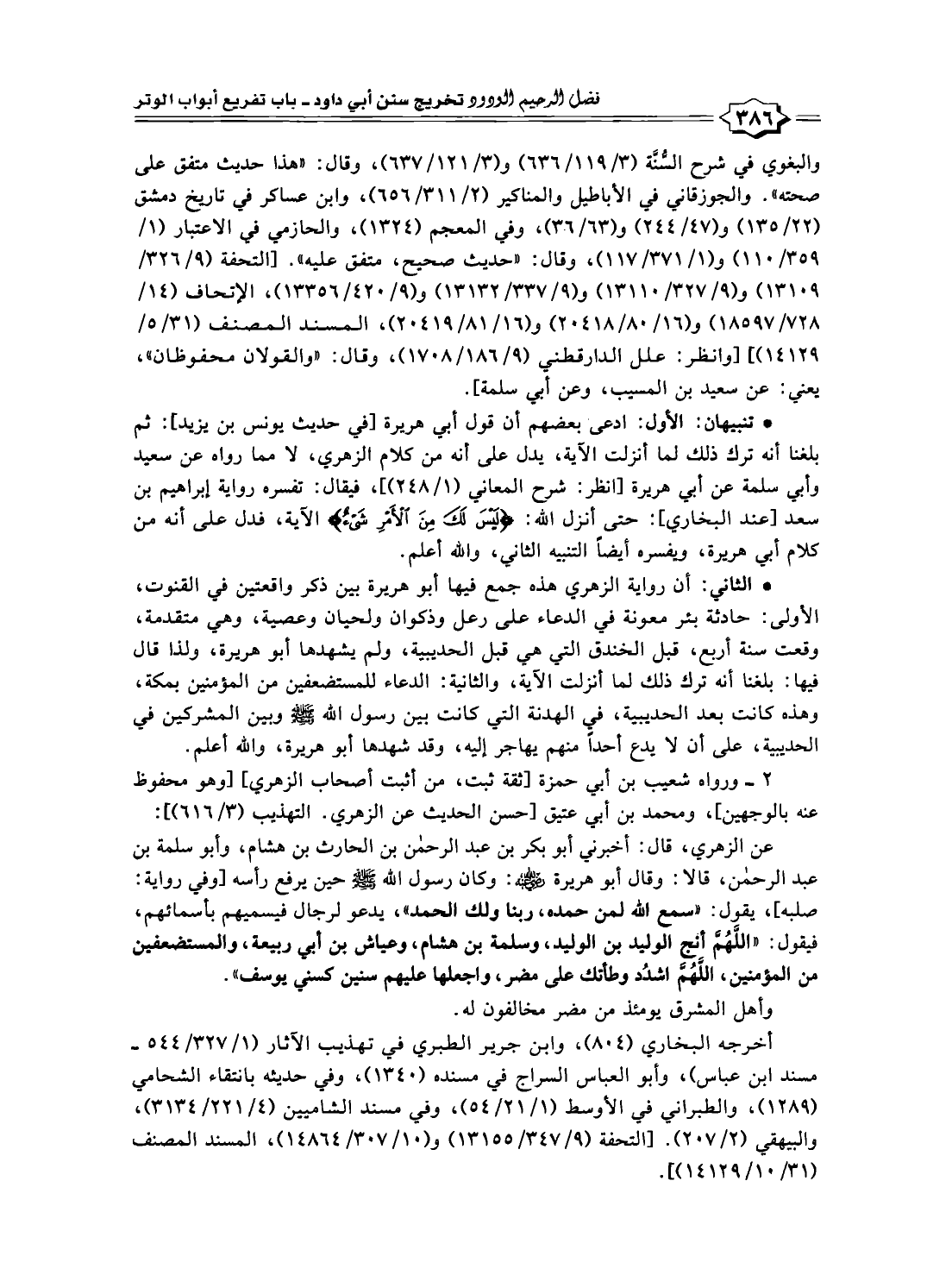 • تنبيهان: الأول: ادعى بعضهم أن قول أبي هريرة [في حديث يونس بن يزيد]: ثم بلغنا أنه ترك ذلك لما أنزلت الآية، يدل على أنه من كلام الزهري، لا مما رواه عن سعيد وأبي سلمة عن أبي هريرة [انظر: شرح المعاني (١/ ٢٤٨)]؛ فيقال: تفسره رواية إبراهيم بن سعد [عند البخاري]: حتى أنزل الله: {لَيْسَ لَكَ مِنَ الْأَمْرِ شَيْءٌ} الآية، فدل على أنه من كلام أبي هريرة، ويفسره أيضًا التنبيه الثاني، والله أعلم.