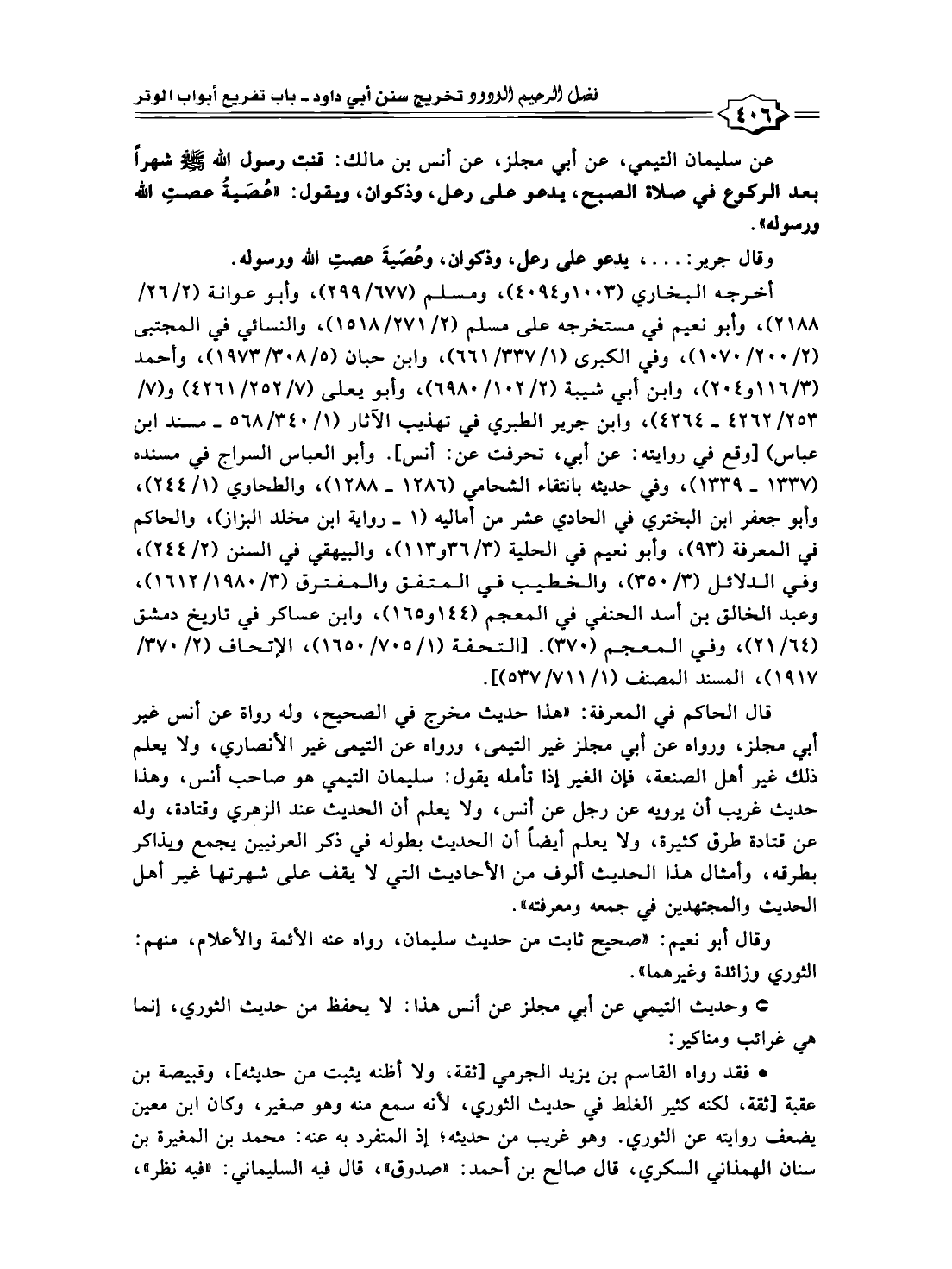 عن سليمان التيمي، عن أبي مجلز، عن أنس بن مالك: قنت رسول الله -صلى الله عليه وسلم- شهرًا بعد الركوع في صلاة الصبح، يدعو على رعل، وذكوان، ويقول: "عُصَيةُ عصتِ الله ورسوله".