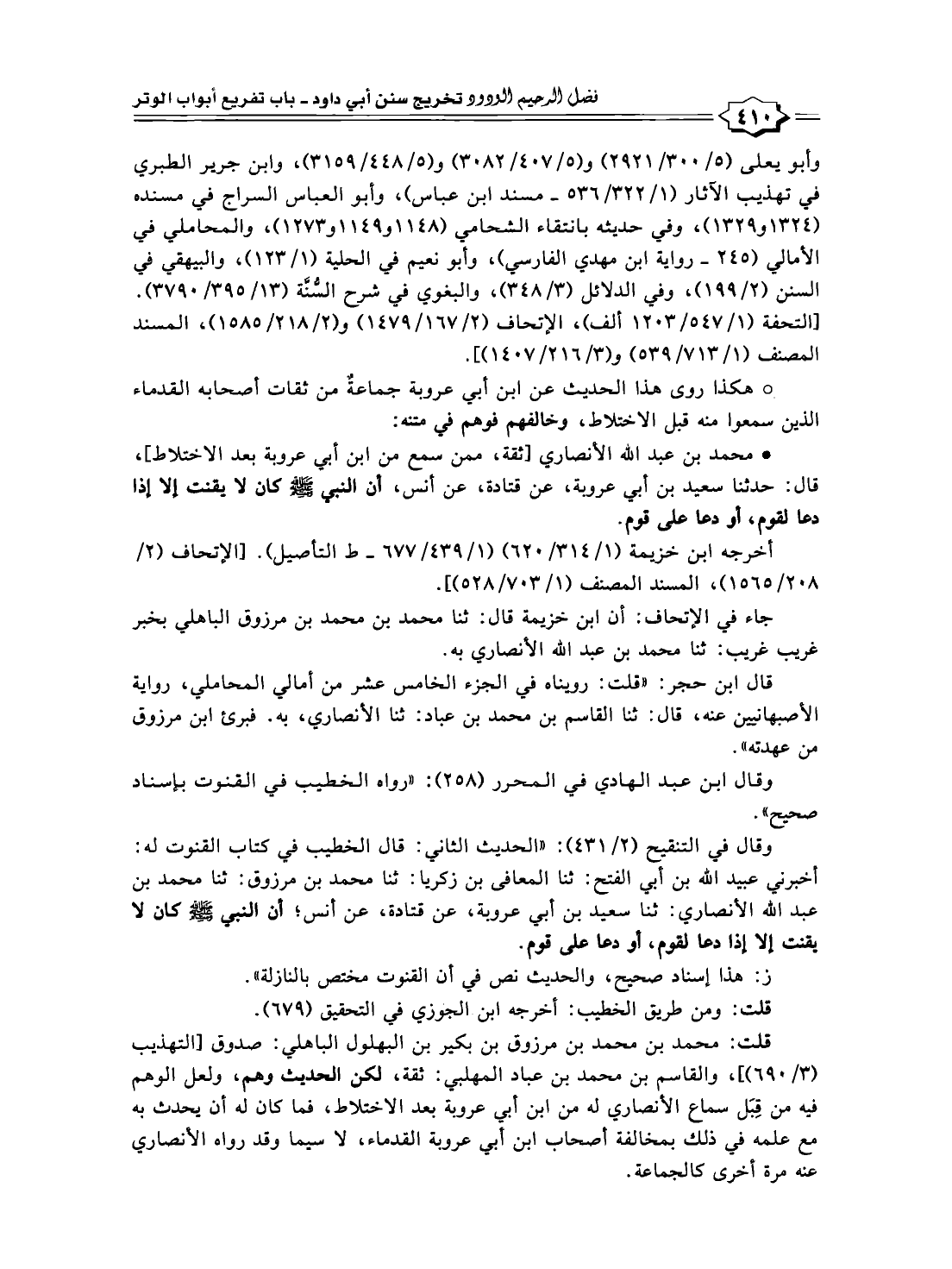 • محمد بن عبد الله الأنصاري [ثقة، ممن سمع من ابن أبي عروبة بعد الاختلاط]، قال: حدثنا سعيد بن أبي عروبة، عن قتادة، عن أنس، أن النبي -صلى الله عليه وسلم- كان لا يقنت إلا إذا دعا لقوم، أو دعا على قوم.