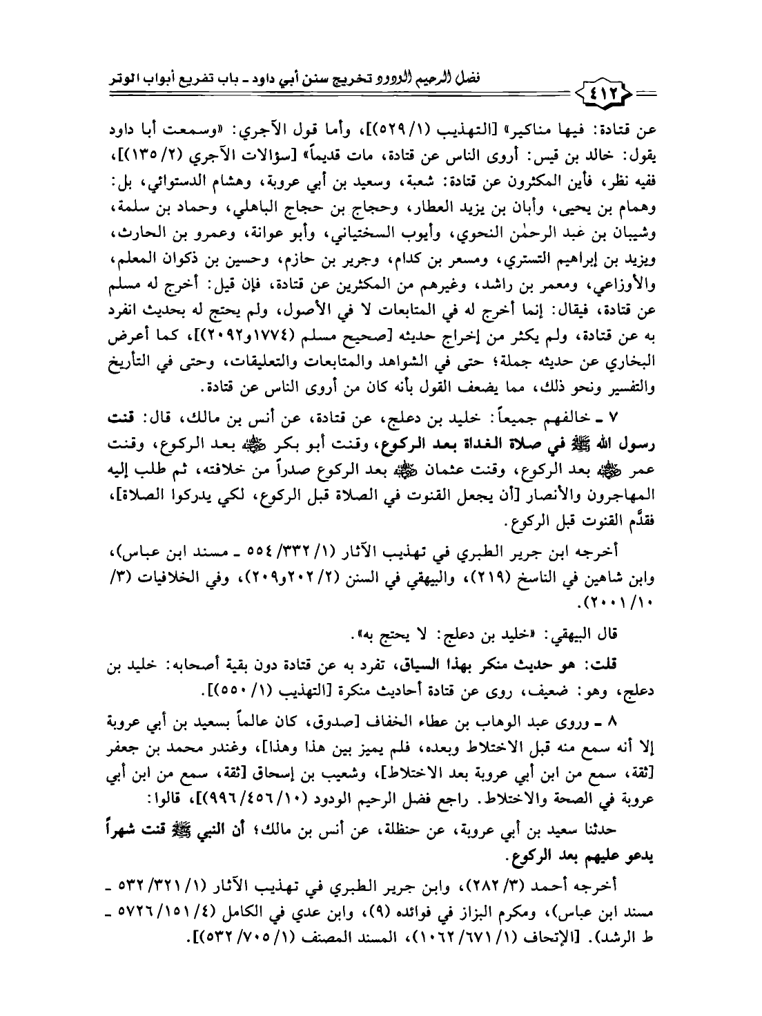 ٧ - خالفهم جميعًا: خليد بن دعلج، عن قتادة، عن أنس بن مالك، قال: قنت رسول الله -صلى الله عليه وسلم- في صلاة الغداة بعد الركوع، وقنت أبو بكر -رضي الله عنه- بعد الركوع، وقنت عمر -رضي الله عنه- بعد الركوع، وقنت عثمان -رضي الله عنه- بعد الركوع صدرًا من خلافته، ثم طلب إليه المهاجرون والأنصار [أن يجعل القنوت في الصلاة قبل الركوع، لكي يدركوا الصلاة]، فقدَّم القنوت قبل الركوع.