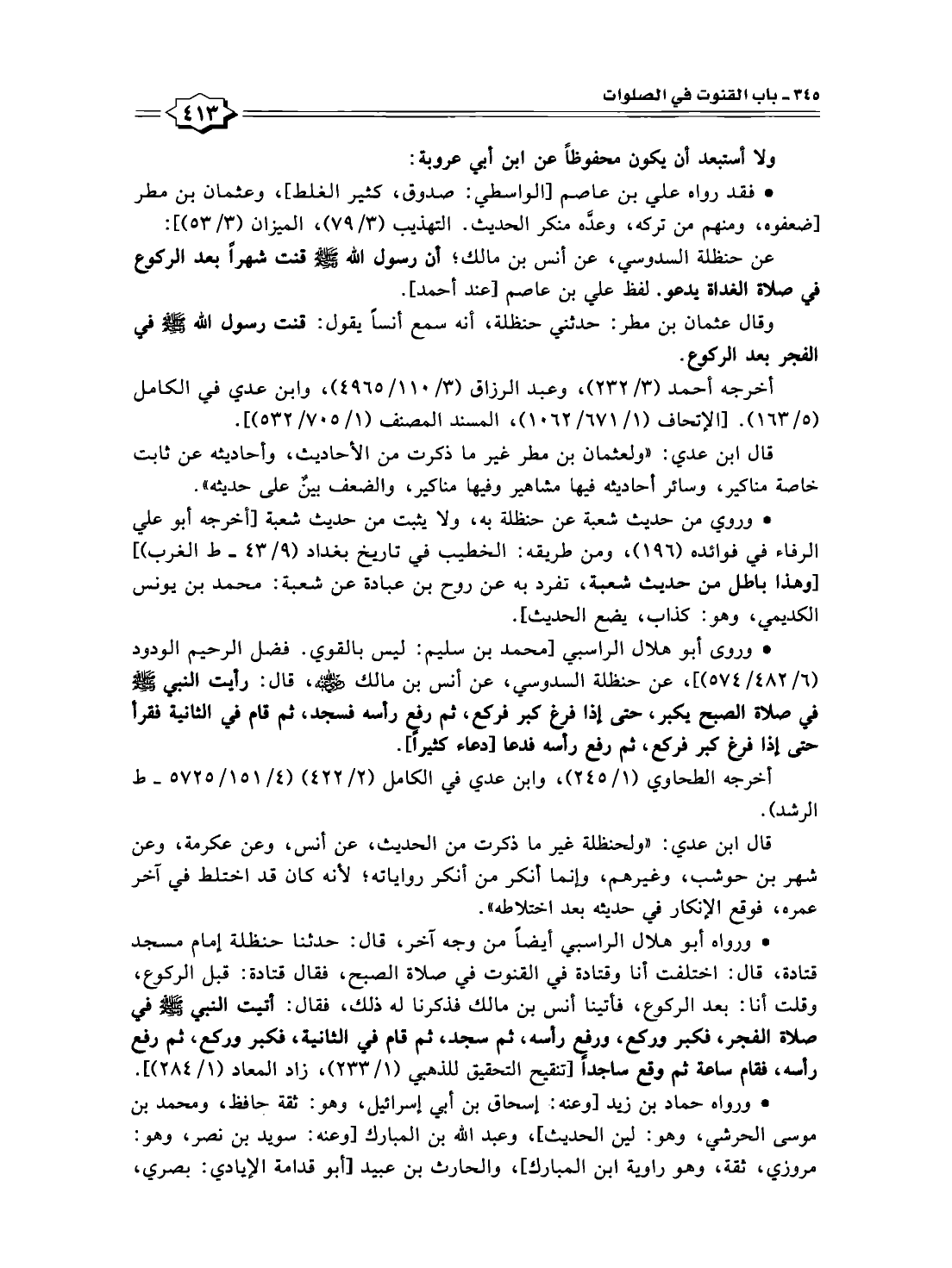 • ورواه أبو هلال الراسبي أيضًا من وجه آخر، قال: حدثنا حنظلة إمام مسجد قتادة، قال: اختلفت أنا وقتادة في القنوت في صلاة الصبح، فقال قتادة: قبل الركوع، وقلت أنا: بعد الركوع، فأتينا أنس بن مالك فذكرنا له ذلك، فقال: أتيت النبي -صلى الله عليه وسلم- في صلاة الفجر، فكبر وركع، ورفع رأسه، ثم سجد، ثم قام في الثانية، فكبر وركع، ثم رفع رأسه، فقام ساعة ثم وقع ساجدًا [تنقيح التحقيق للذهبي (١/ ٢٣٣)، زاد المعاد (١/ ٢٨٤)].