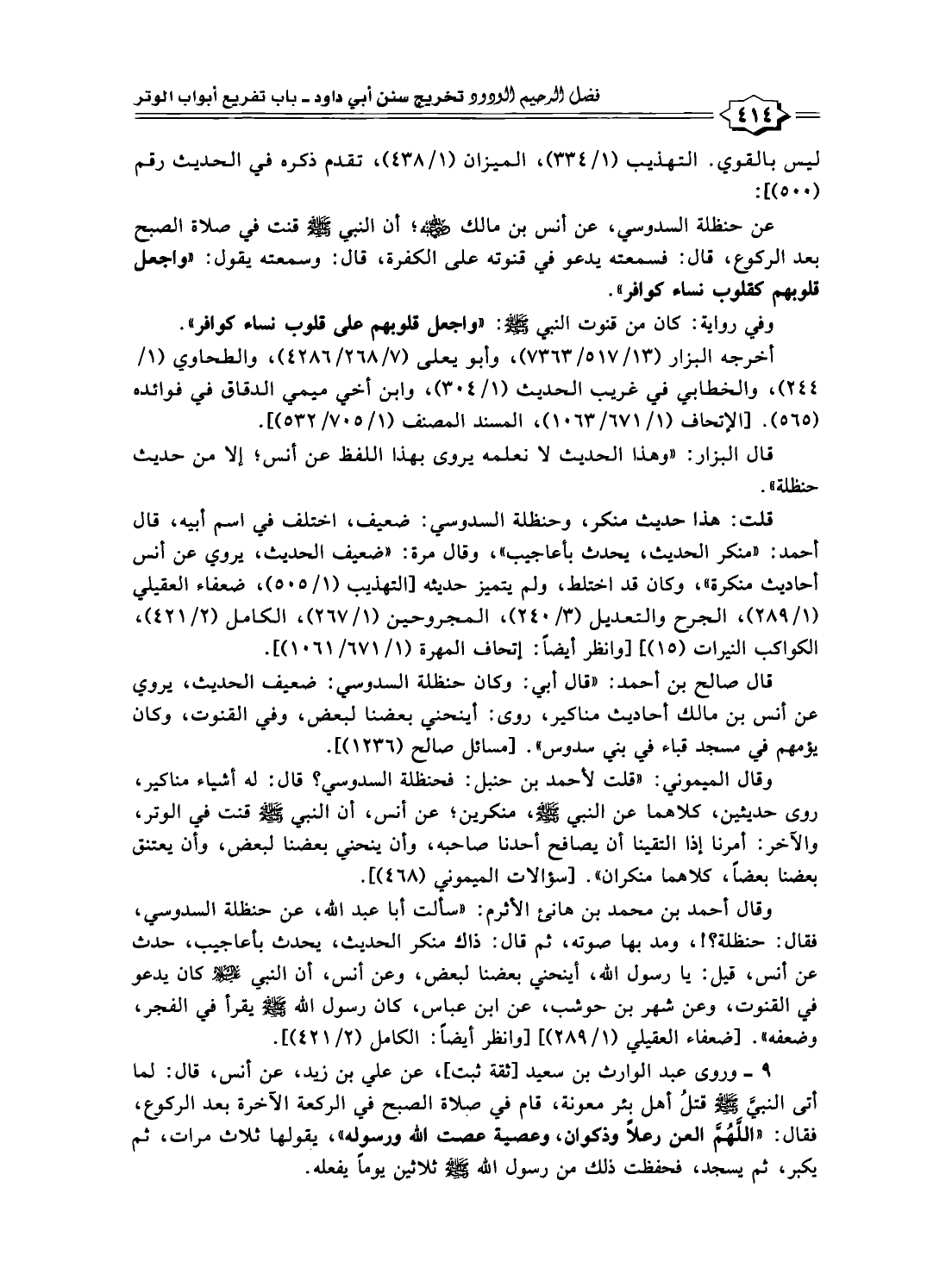 عن حنظلة السدوسي، عن أنس بن مالك -رضي الله عنه-؛ أن النبي -صلى الله عليه وسلم- قنت في صلاة الصبح بعد الركوع، قال: فسمعته يدعو في قنوته على الكفرة، قال: وسمعته يقول: "واجعل قلوبهم كقلوب نساء كوافر".