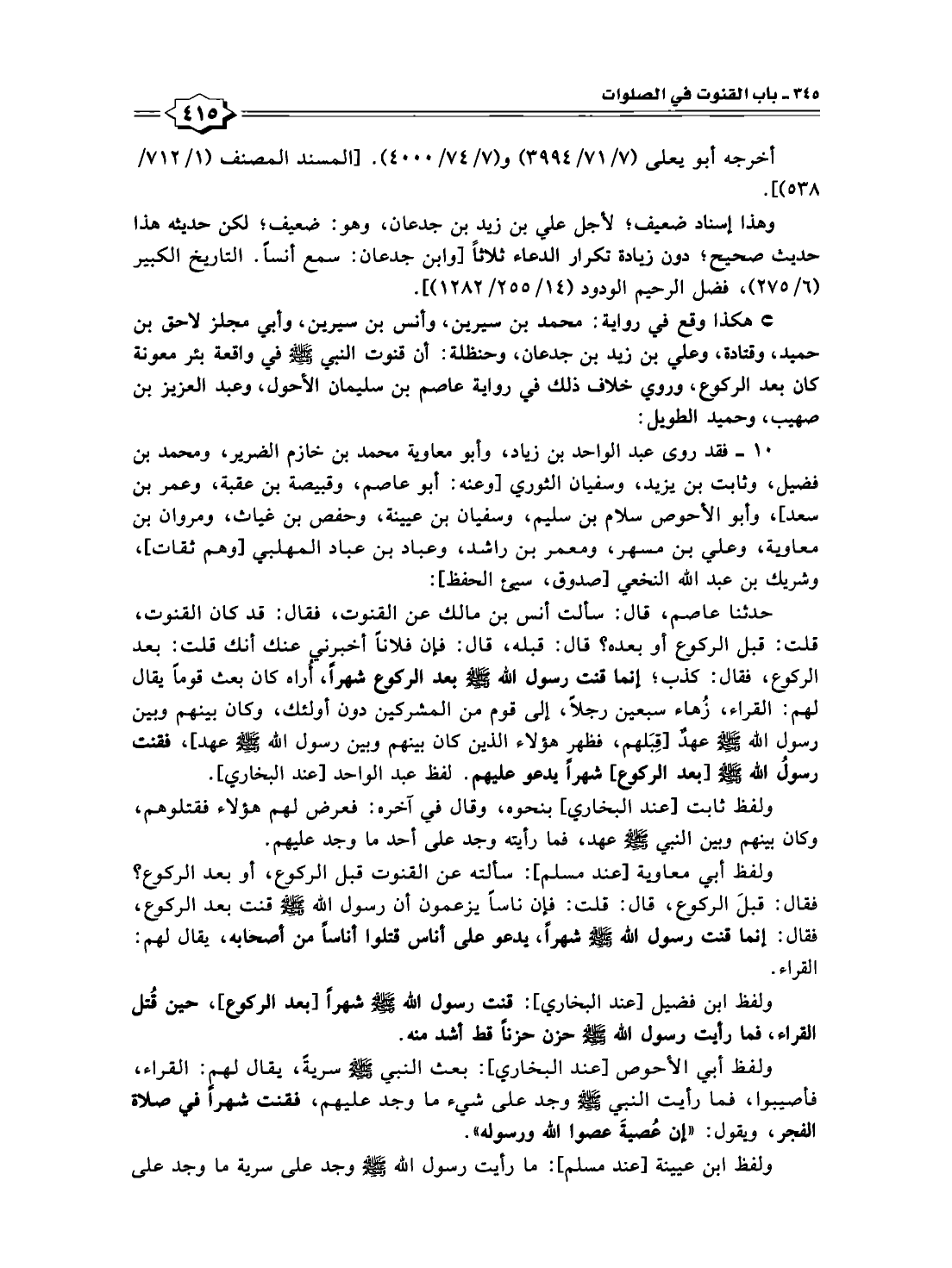 * هكذا وقع في رواية: محمد بن سيرين، وأنس بن سيرين، وأبي مجلز لاحق بن حميد، وقتادة، وعلي بن زيد بن جدعان، وحنظلة: أن قنوت النبي -صلى الله عليه وسلم- في واقعة بئر معونة كان بعد الركوع، وروي خلاف ذلك في رواية عاصم بن سليمان الأحول، وعبد العزيز بن صهيب، وحميد الطويل: