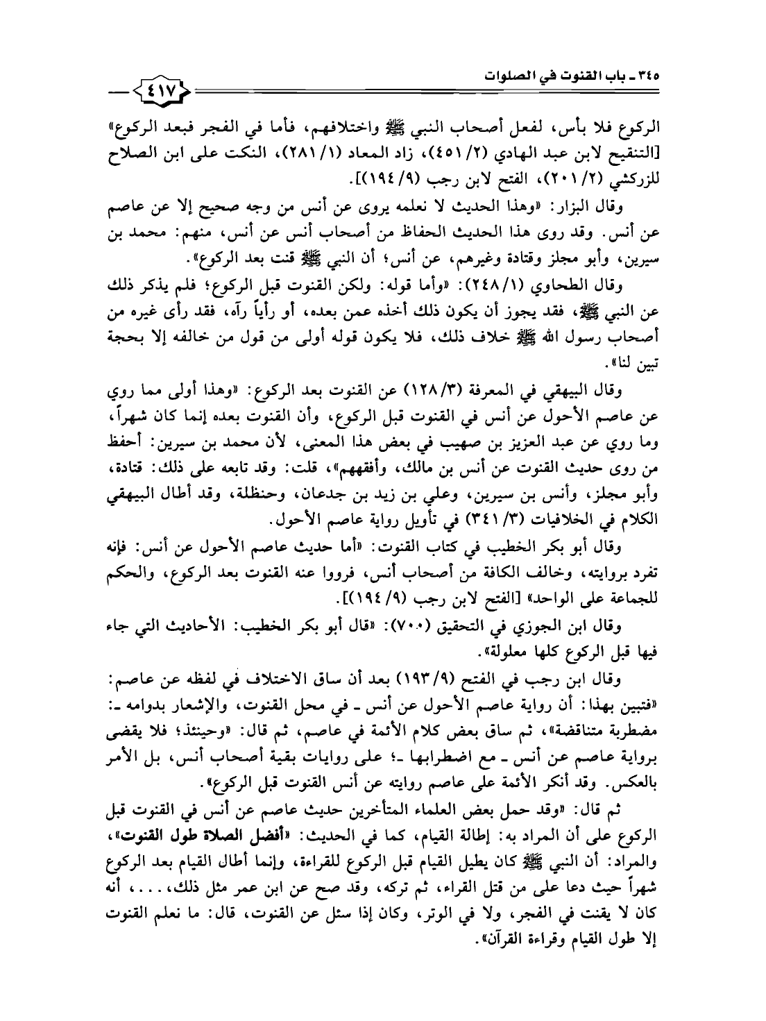 وقال ابن رجب في الفتح (٩/ ١٩٣) بعد أن ساق الاختلاف في لفظه عن عاصم: "فتبين بهذا: أن رواية عاصم الأحول عن أنس -في محل القنوت، والإشعار بدوامه-: مضطربة متناقضة"، ثم ساق بعض كلام الأئمة في عاصم، ثم قال: "وحينئذ؛ فلا يقضى برواية عاصم عن أنس -مع اضطرابها-؛ على روايات بقية أصحاب أنس، بل الأمر بالعكس. وقد أنكر الأئمة على عاصم روايته عن أنس القنوت قبل الركوع".