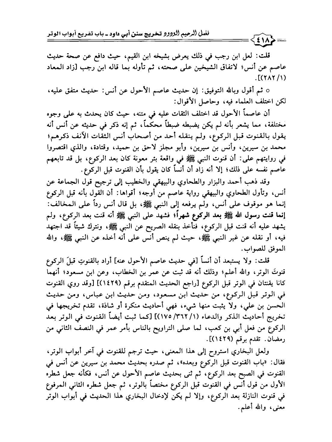 قلت: ولا يستبعد أن أنسًا [في حديث عاصم الأحول عنه] أراد بالقنوتِ قبلَ الركوع قنوتَ الوتر، والله أعلم؛ وذلك أنه قد ثبت عن عمر بن الخطاب، وعن ابن مسعود؛ أنهما كانا يقنتان في الوتر قبل الركوع [راجع الحديث المتقدم برقم (١٤٢٩)] [وقد روي القنوت في الوتر قبل الركوع، من حديث ابن مسعود، ومن حديث ابن عباس، ومن حديث الحسن بن علي، ولا يثبت منها شيء، فهي أحاديث منكرة أو شاذة، تقدم تخريجها في تخريج أحاديث الذكر والدعاء (١/ ٣٦٢/ ١٧٥)، [كما ثبت أيضًا لقنوت في الوتر بعد الركوع من فعل أبي بن كعب، لما صلى التراويح بالناس بأمر عمر في النصف الثاني من رمضان. تقدم برقم (١٤٢٩)].