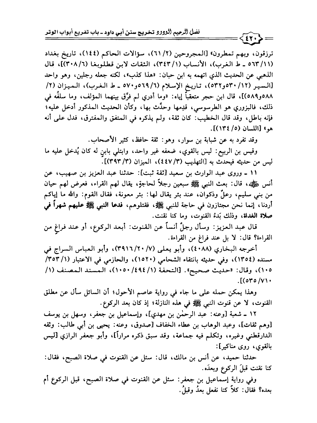 ١١ - وروى عبد الوارث بن سعيد [ثقة ثبت]: حدثنا عبد العزيز بن صهيب، عن أنس -رضي الله عنه-، قال: بعث النبي -صلى الله عليه وسلم- سبعين رجلًا لحاجةٍ، يقال لهم القراء، فعرض لهم حيان من بني سليم، رعلٌ وذكوان، عند بئر يقال لها: بئر معونة، فقال القوم: والله ما إياكم أردنا، إنما نحن مجتازون في حاجة للنبي -صلى الله عليه وسلم-، فقتلوهم، فدعا النبي -صلى الله عليه وسلم- عليهم شهرًا في صلاة الغداة، وذلك بَدءُ القنوت، وما كنا نقنت.