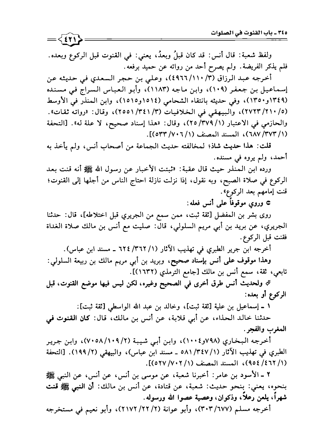ورده ابن المنذر حيث قال عقبة: "ثبتت الأخبار عن رسول الله -صلى الله عليه وسلم- أنه قنت بعد الركوع في صلاة الصبح، وبه نقول، إذا نزلت نازلة احتاج الناس من أجلها إلى القنوت؛ قنت إمامهم بعد الركوع".