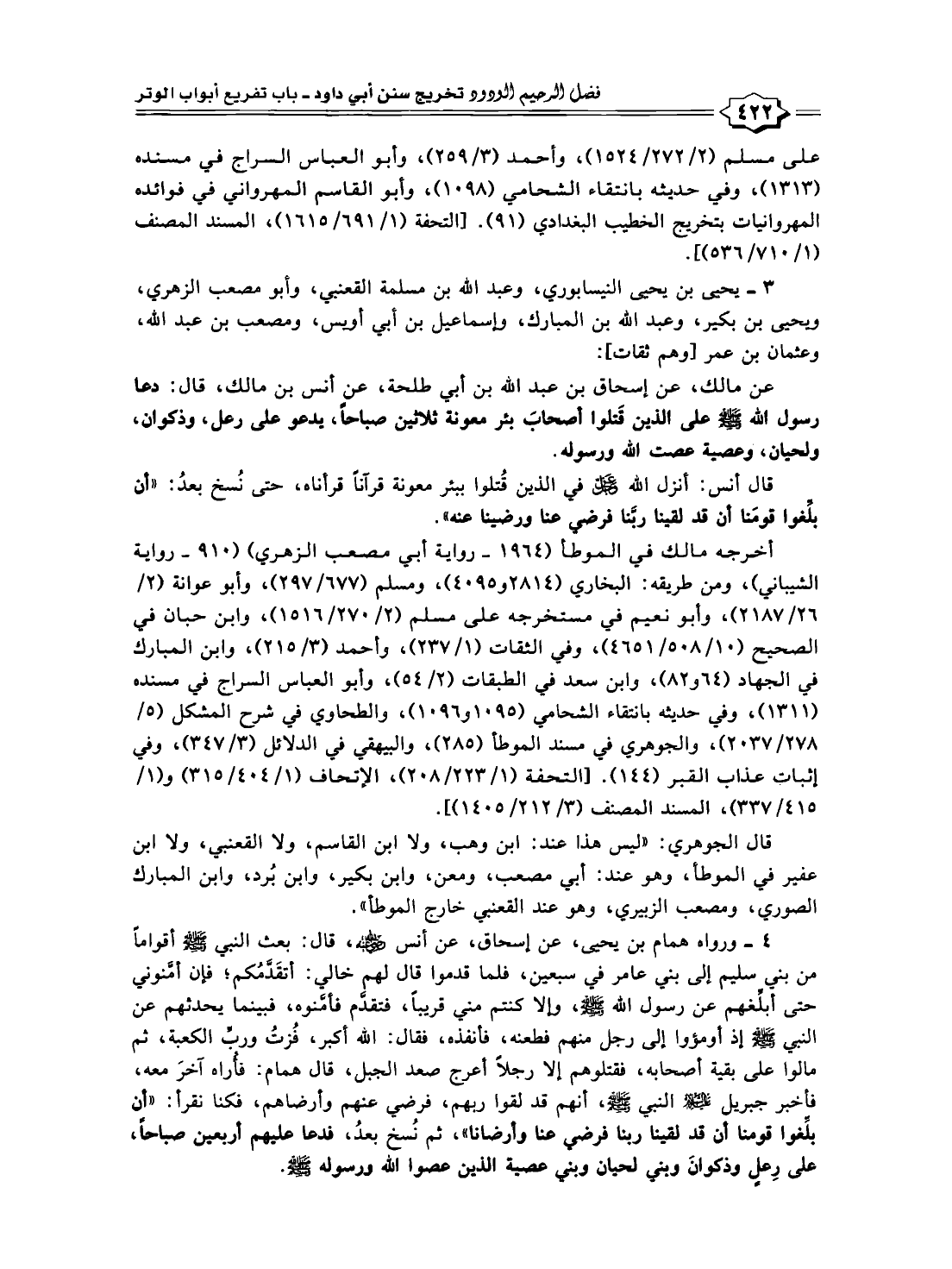 عن مالك، عن إسحاق بن عبد الله بن أبي طلحة، عن أنس بن مالك، قال: دعا رسول الله -صلى الله عليه وسلم- على الذين قَتلوا أصحابَ بئر معونة ثلاثين صباحًا، يدعو على رعل، وذكوان، ولحيان، وعصية عصت الله ورسوله.