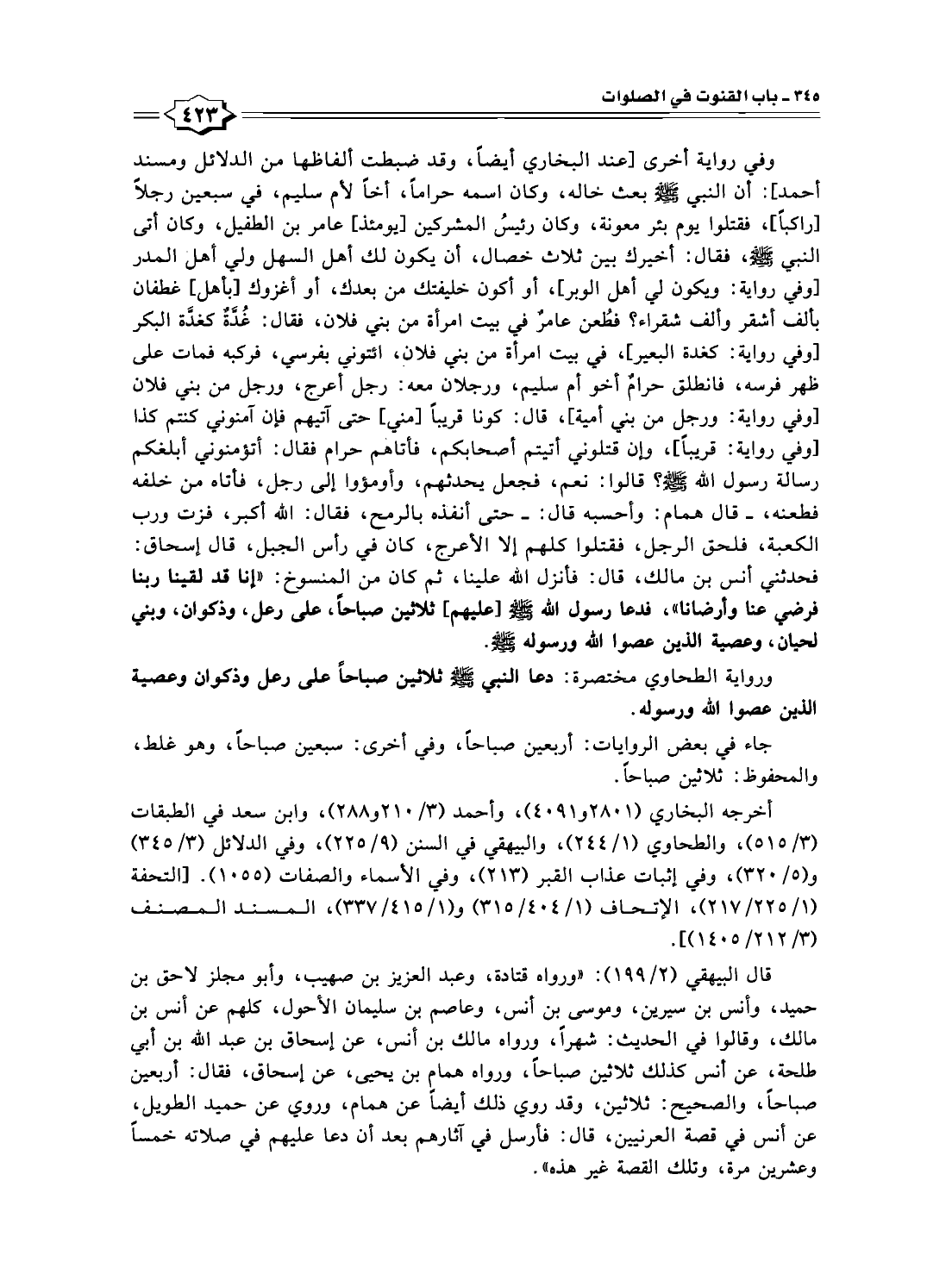 قال البيهقي (٢/ ١٩٩): "ورواه قتادة، وعبد العزيز بن صهيب، وأبو مجلز لاحق بن حميد، وأنس بن سيرين، وموسى بن أنس، وعاصم بن سليمان الأحول، كلهم عن أنس بن مالك، وقالوا في الحديث: شهرًا، ورواه مالك بن أنس، عن إسحاق بن عبد الله بن أبي طلحة، عن أنس كذلك ثلاثين صباحًا، ورواه همام بن يحيى، عن إسحاق، فقال: أربعين صباحًا، والصحيح: ثلاثين، وقد روي ذلك أيضًا عن همام، وروي عن حميد الطويل، عن أنس في قصة العرنيين، قال: فأرسل في آثارهم بعد أن دعا عليهم في صلاته خمسًا وعشرين مرة، وتلك القصة غير هذه".