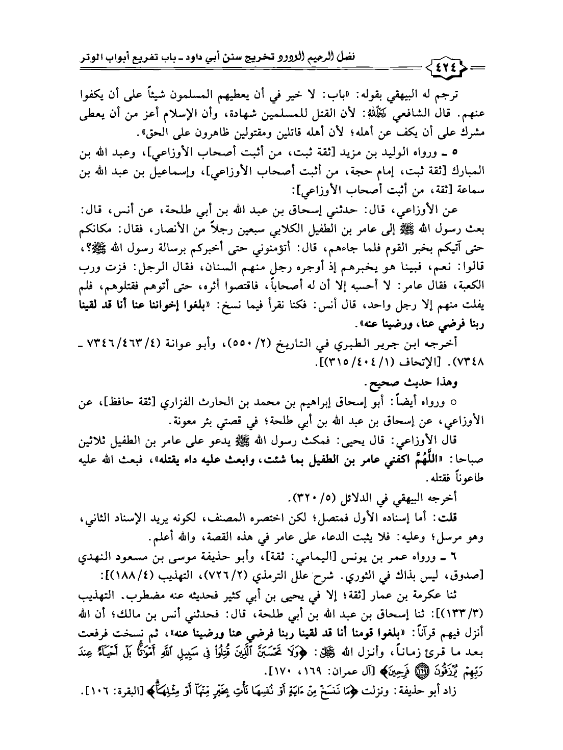 ° ورواه أيضًا: أبو إسحاق إبراهيم بن محمد بن الحارث الفزاري [ثقة حافظ]، عن الأوزاعي، عن إسحاق بن عبد الله بن أبي طلحة؛ في قصتي بئر معونة.