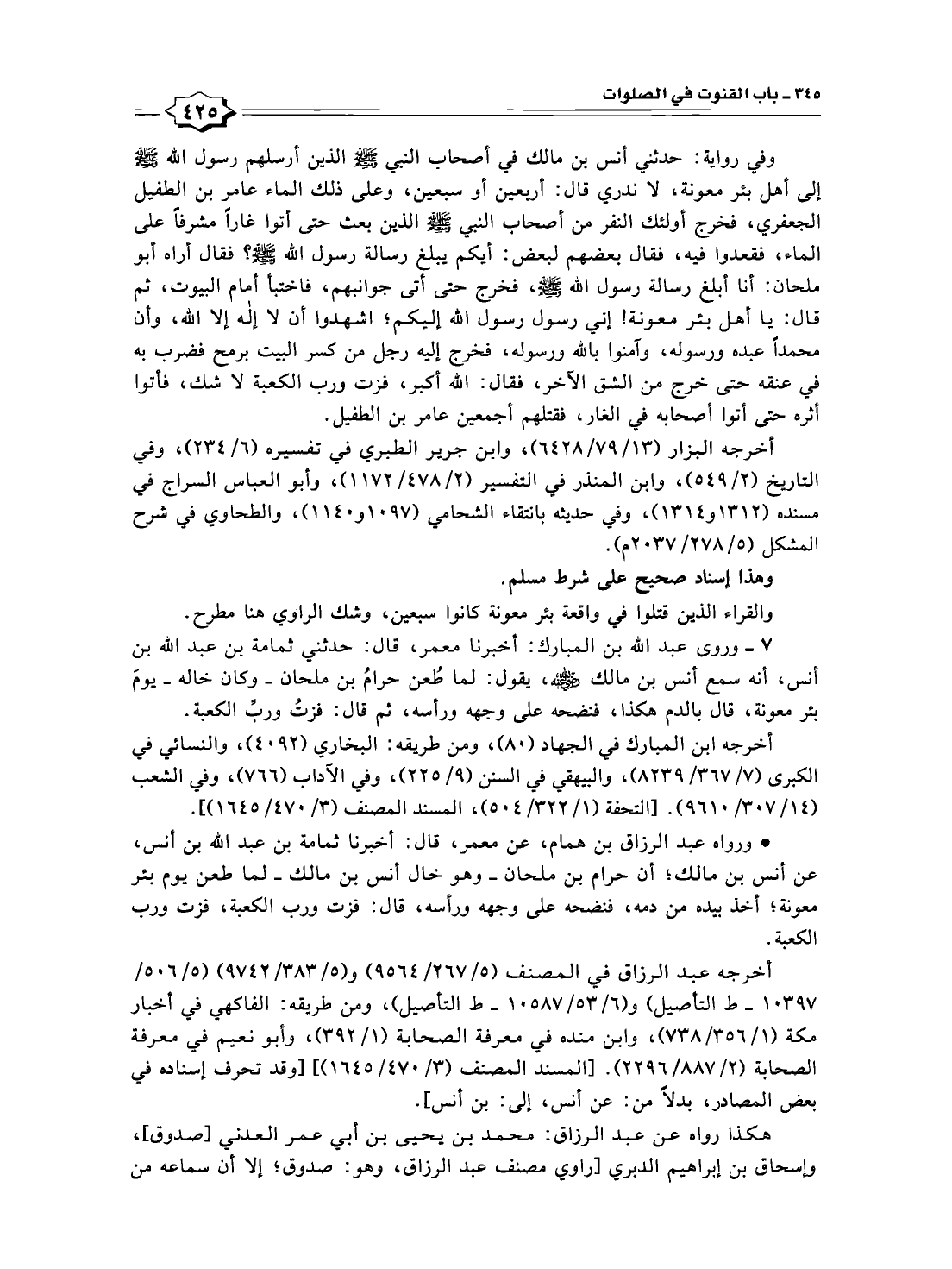 • ورواه عبد الرزاق بن همام، عن معمر، قال: أخبرنا ثمامة بن عبد الله بن أنس، عن أنس بن مالك؛ أن حرام بن ملحان -وهو خال أنس بن مالك- لما طعن يوم بئر معونة؛ أخذ بيده من دمه، فنضحه على وجهه ورأسه، قال: فزت ورب الكعبة، فزت ورب الكعبة.
