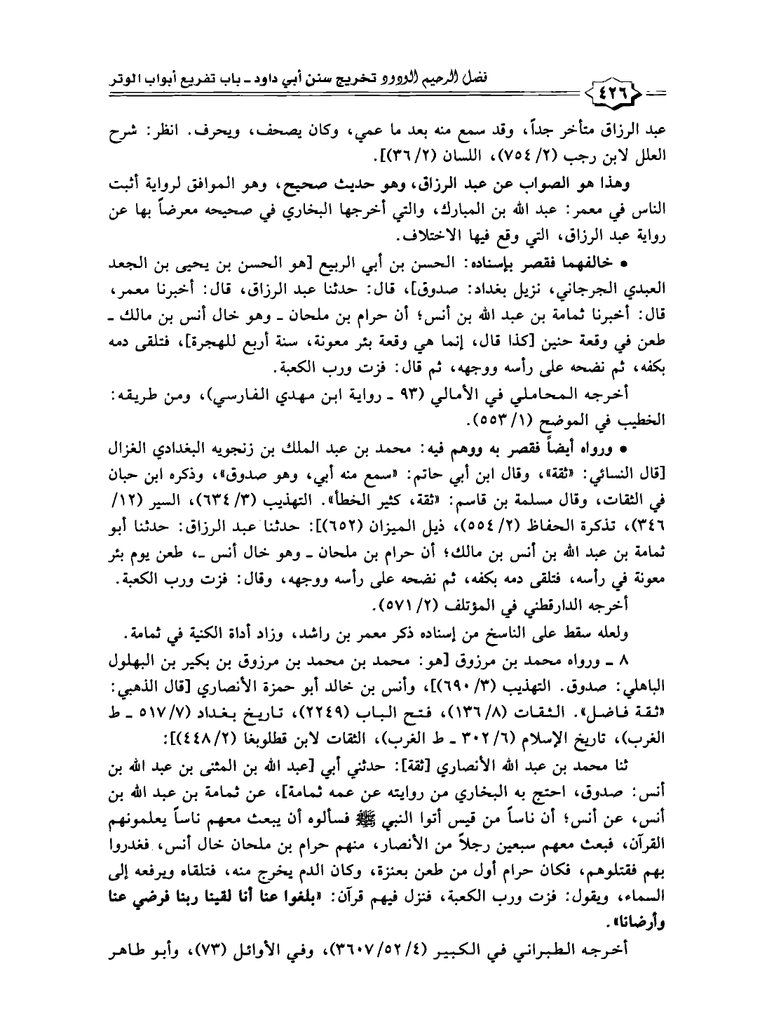 • ورواه أيضًا فقصر به ووهم فيه: محمد بن عبد الملك بن زنجويه البغدادي الغزال [قال النسائي: "ثقة"، وقال ابن أبي حاتم: "سمع منه أبي، وهو صدوق"، وذكره ابن حبان في الثقات، وقال مسلمة بن قاسم: "ثقة، كثير الخطأ". التهذيب (٣/ ٦٣٤)، السير (١٢/ ٣٤٦)، تذكرة الحفاظ (٢/ ٥٥٤)، ذيل الميزان (٦٥٢)]: حدثنا عبد الرزاق: حدثنا أبو ثمامة بن عبد الله بن أنس بن مالك؛ أن حرام بن ملحان -وهو خال أنس-، طعن يوم بئر معونة في رأسه، فتلقى دمه بكفه، ثم نضحه على رأسه ووجهه، وقال: فزت ورب الكعبة.