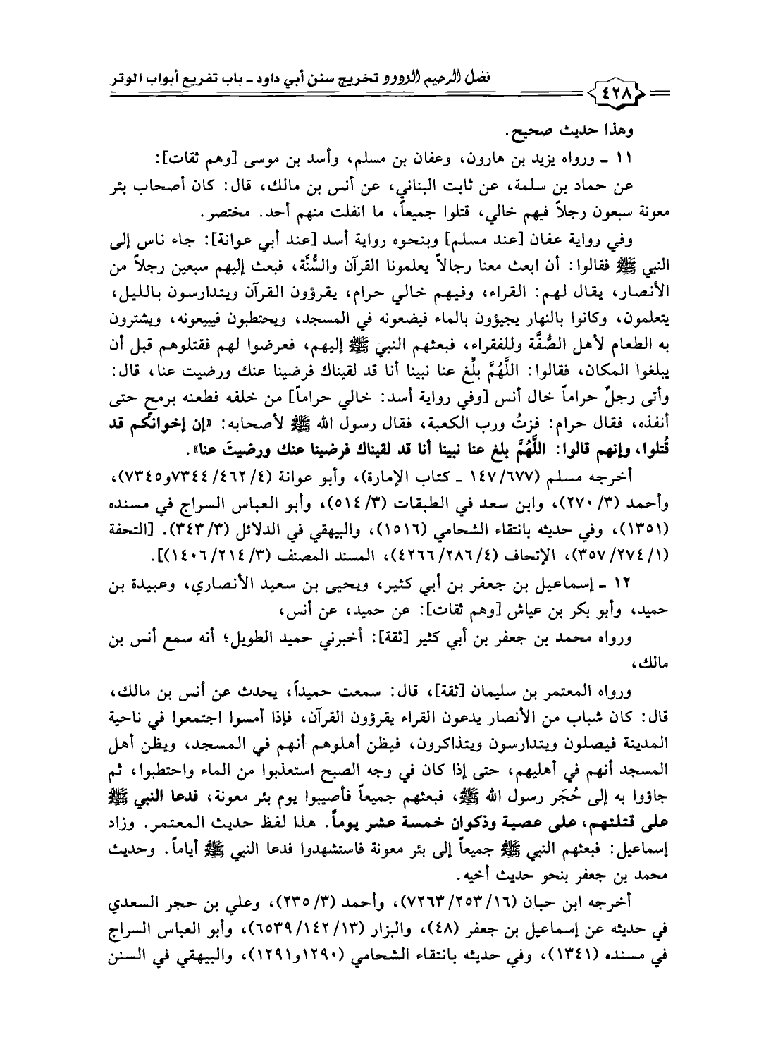 ورواه محمد بن جعفر بن أبي كثير [ثقة]: أخبرني حميد الطويل؛ أنه سمع أنس بن مالك، ورواه المعتمر بن سليمان [ثقة]، قال: سمعت حميدًا، يحدث عن أنس بن مالك، قال: كان شباب من الأنصار يدعون القراء يقرؤون القرآن، فإذا أمسوا اجتمعوا في ناحية المدينة فيصلون ويتدارسون ويتذاكرون، فيظن أهلوهم أنهم في المسجد، ويظن أهل المسجد أنهم في أهليهم، حتى إذا كان في وجه الصبح استعذبوا من الماء واحتطبوا، ثم جاؤوا به إلى حُجَر رسول الله -صلى الله عليه وسلم-، فبعثهم جميعًا فأصيبوا يوم بئر معونة، فدعا النبي -صلى الله عليه وسلم- على قتلتهم، على عصية وذكوان خمسة عشر يومًا. هذا لفظ حديث المعتمر. وزاد إسماعيل: فبعثهم النبي -صلى الله عليه وسلم- جميعًا إلى بئر معونة فاستشهدوا فدعا النبي -صلى الله عليه وسلم- أيامًا. وحديث محمد بن جعفر بنحو حديث أخيه.