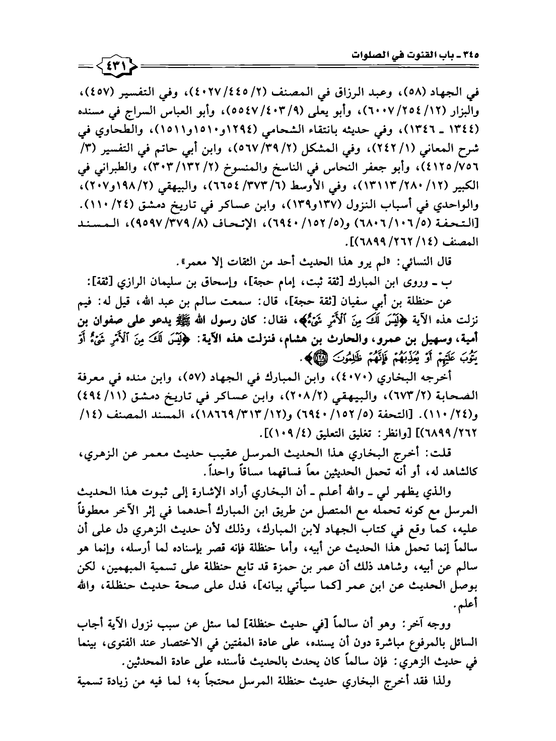 عن حنظلة بن أبي سفيان [ثقة حجة]، قال: سمعت سالم بن عبد الله، قيل له: فيم نزلت هذه الآية {لَيْسَ لَكَ مِنَ الْأَمْرِ شَيْءٌ}، فقال: كان رسول الله -صلى الله عليه وسلم- يدعو على صفوان بن أمية، وسهيل بن عمرو، والحارث بن هشام، فنزلت هذه الآية: {لَيْسَ لَكَ مِنَ الْأَمْرِ شَيْءٌ أَوْ يَتُوبَ عَلَيْهِمْ أَوْ يُعَذِّبَهُمْ فَإِنَّهُمْ ظَالِمُونَ (١٢٨)}.