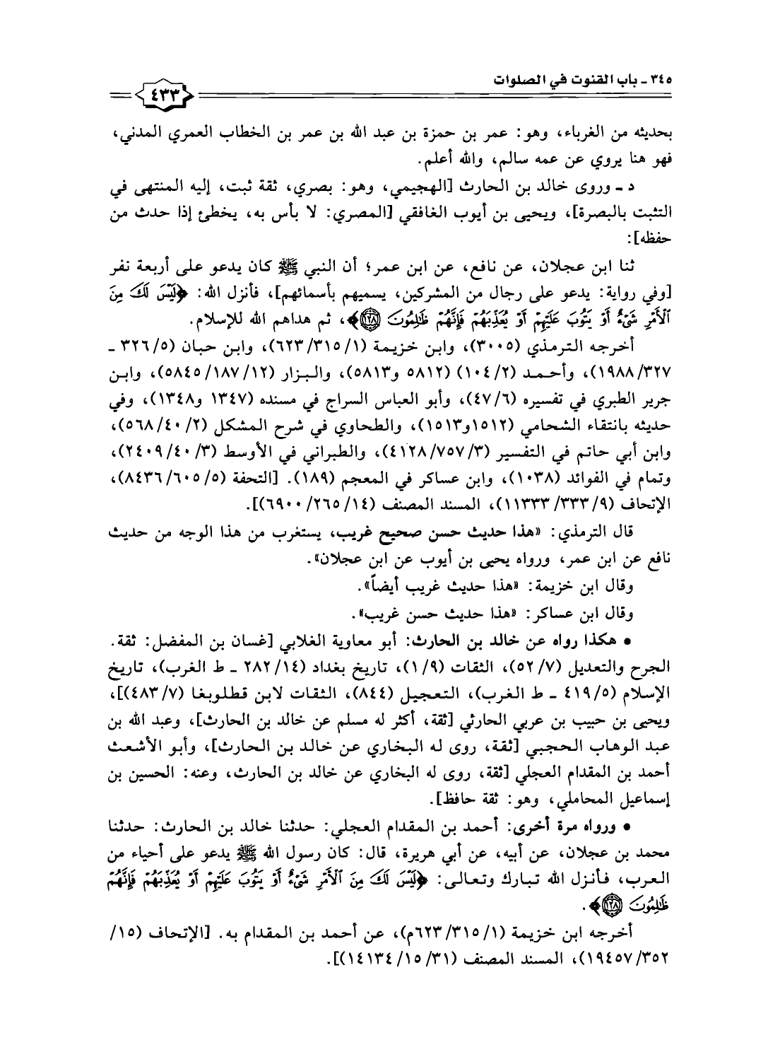• ورواه مرة أخرى: أحمد بن المقدام العجلي: حدثنا خالد بن الحارث: حدثنا محمد بن عجلان، عن أبيه، عن أبي هريرة، قال: كان رسول الله -صلى الله عليه وسلم- يدعو على أحياء من العرب، فأنزل الله تبارك وتعالى: {لَيْسَ لَكَ مِنَ الْأَمْرِ شَيْءٌ أَوْ يَتُوبَ عَلَيْهِمْ أَوْ يُعَذِّبَهُمْ فَإِنَّهُمْ ظَالِمُونَ (١٢٨)}.