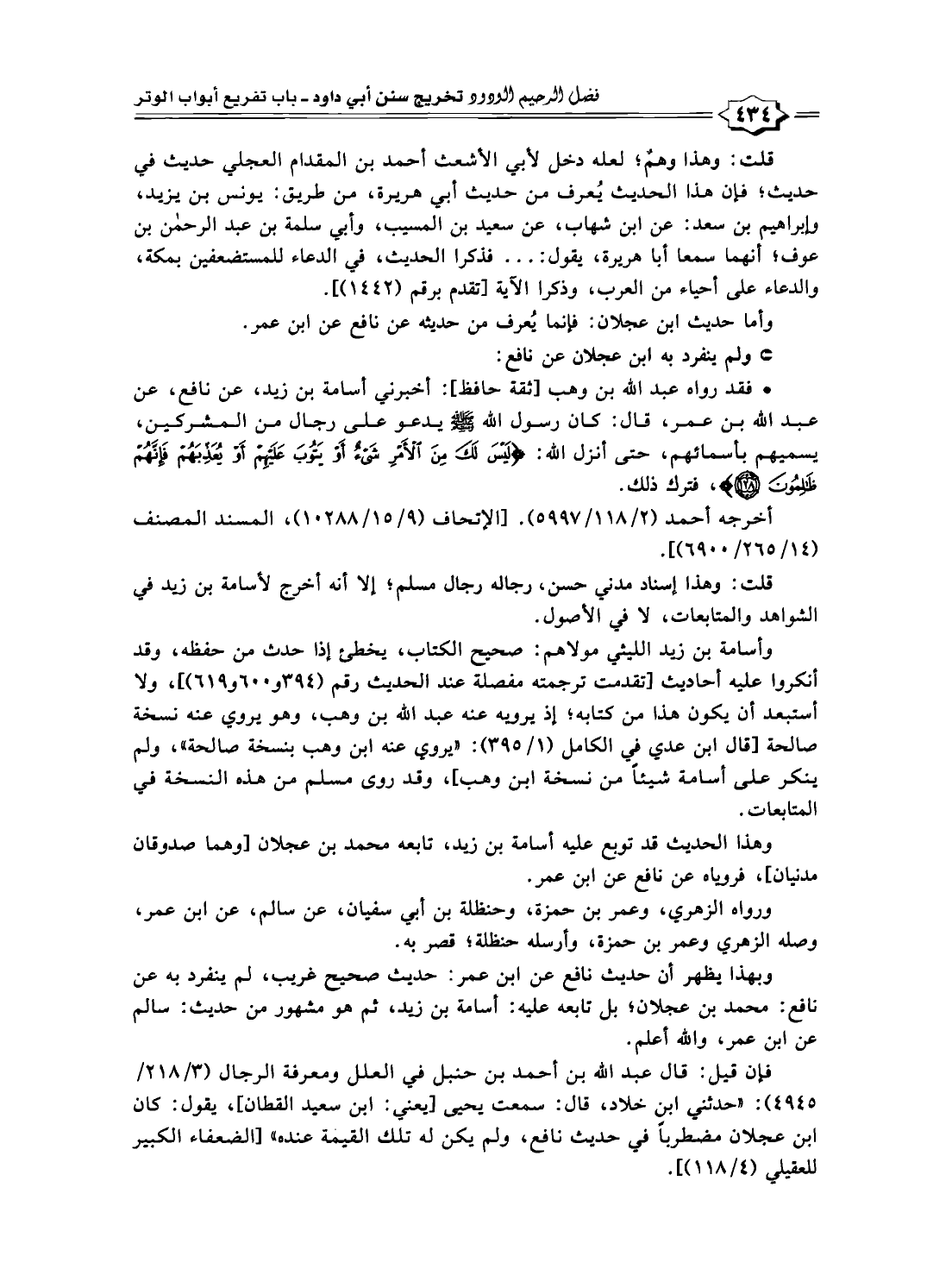 • فقد رواه عبد الله بن وهب [ثقة حافظ]: أخبرني أسامة بن زيد، عن نافع، عن عبد الله بن عمر، قال: كان رسول الله -صلى الله عليه وسلم- يدعو على رجال من المشركين، يسميهم بأسمائهم، حتى أنزل الله: {لَيْسَ لَكَ مِنَ الْأَمْرِ شَيْءٌ أَوْ يَتُوبَ عَلَيْهِمْ أَوْ يُعَذِّبَهُمْ فَإِنَّهُمْ ظَالِمُونَ (١٢٨)}، فترك ذلك.