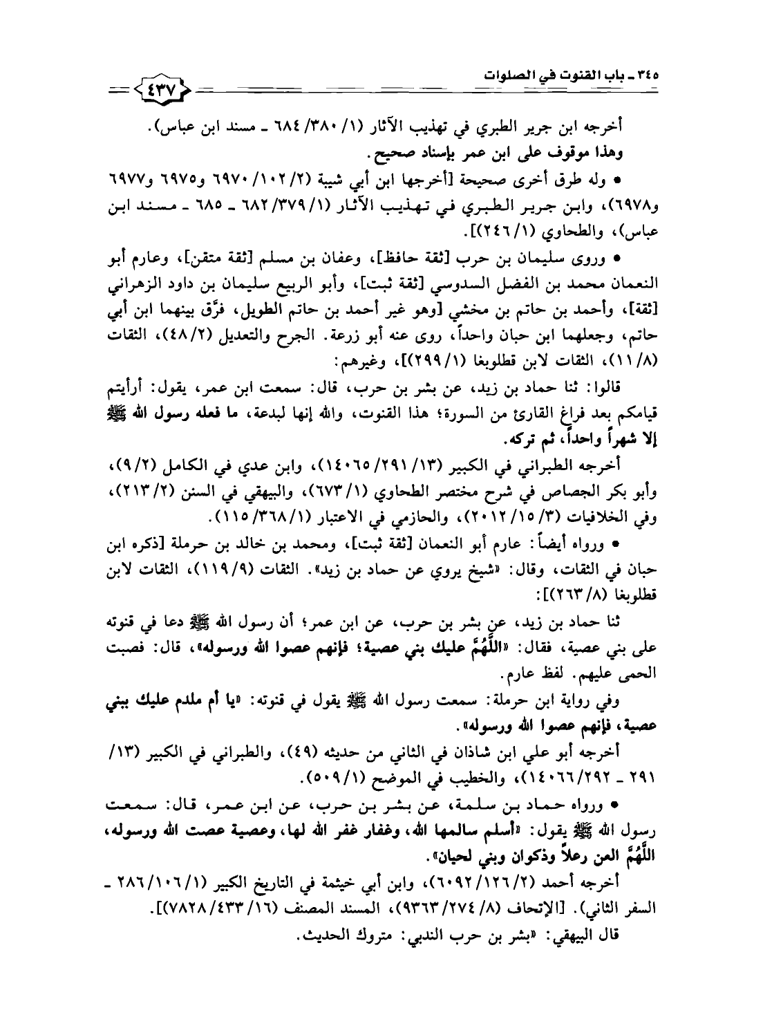 قالوا: ثنا حماد بن زيد، عن بشر بن حرب، قال: سمعت ابن عمر، يقول: أرأيتم قيامكم بعد فراغٍ القارئ من السورة؛ هذا القنوت، والله إنها لبدعة، ما فعله رسول الله -صلى الله عليه وسلم- إلا شهرًا واحدا، ثم تركه.