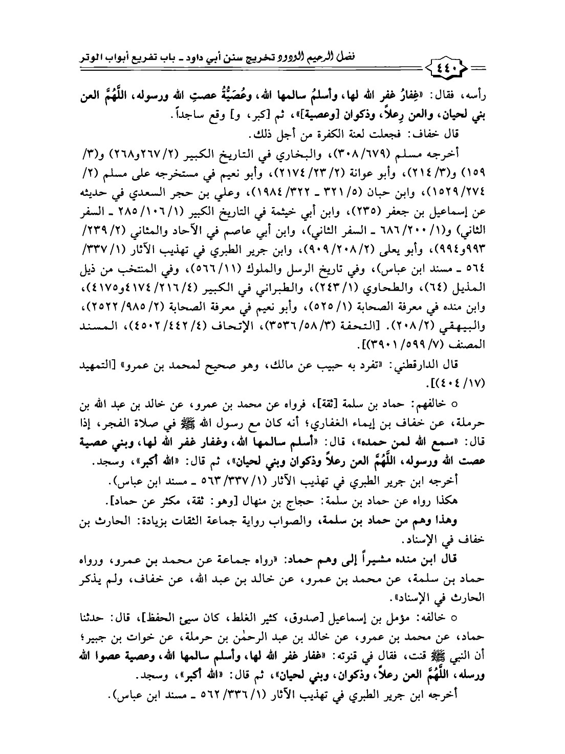 * خالفه: مؤمل بن إسماعيل [صدوق، كثير الغلط، كان سيئ الحفظ]، قال: حدثنا حماد، عن محمد بن عمرو، عن خالد بن عبد الرحمن بن حرملة، عن خوات بن جبير؛ أن النبي - صلى الله عليه وسلم - قنت، فقال في قنوته: "غفار غفر الله لها، وأسلم سالمها الله، وعصية عصوا الله ورسله، اللَّهُمَّ العن رعلًا، وذكوان، وبني لحيان"، ثم قال: "الله أكبر"، وسجد.