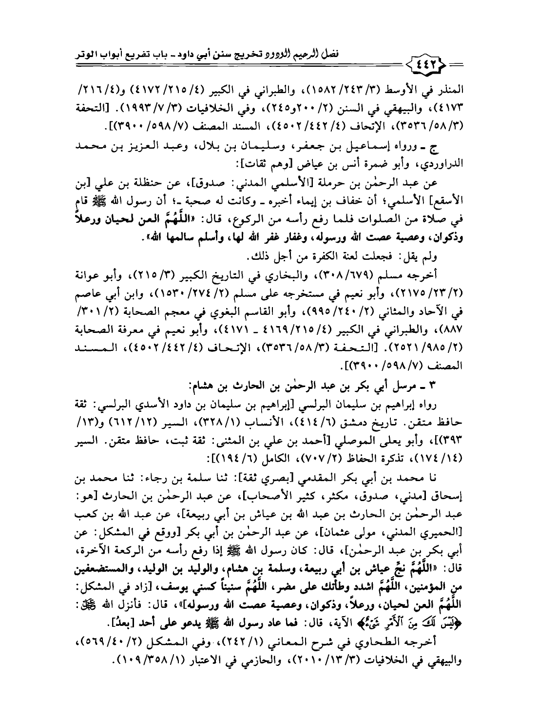 نا محمد بن أبي بكر المقدمي [بصري ثقة]: ثنا سلمة بن رجاء: ثنا محمد بن إسحاق [مدني، صدوق، مكثر، كثير الأصحاب]، عن عبد الرحمن بن الحارث [هو: عبد الرحمن بن الحارث بن عبد الله بن عياش بن أبي ربيعة]، عن عبد الله بن كعب [الحميري المدني، مولى عثمان]، عن عبد الرحمن بن أبي بكر [ووقع في المشكل: عن أبي بكر بن عبد الرحمن]، قال: كان رسول اللّه - صلى الله عليه وسلم - إذا رفع رأسه من الركعة الآخرة، قال: "اللَّهُمَّ نجِّ عياش بن أبي ربيعة، وسلمة بن هشام، والوليد بن الوليد، والمستضعفين من المؤمنين، اللَّهُمَّ اشدد وطأتك على مضر، اللَّهُمَّ سنينًا كسني يوسف، [زاد في المشكل: اللَّهُمَّ العن لحيان، ورعلًا، وذكوان، وعصية عصت الله ورسوله] "، قال: فأنزل اللّه - عز وجل -: {لَيْسَ لَكَ مِنَ الْأَمْرِ شَيْءٌ} الآية، قال: فما عاد رسول الله - صلى الله عليه وسلم - يدعو على أحد [بعدُ].