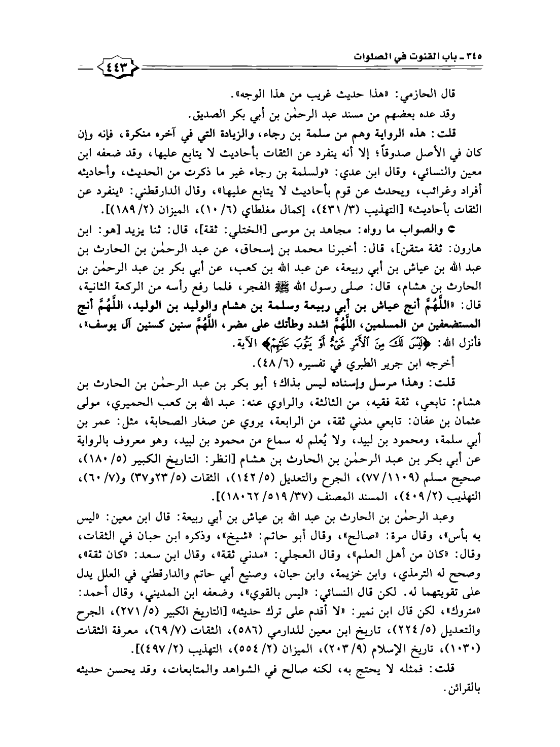 * والصواب ما رواه: مجاهد بن موسى [الختلي: ثقة]، قال: ثنا يزيد [هو: ابن هارون: ثقة متقن]، قال: أخبرنا محمد بن إسحاق، عن عبد الرحمن بن الحارث بن عبد اللّه بن عياش بن أبي ربيعة، عن عبد الله بن كعب، عن أبي بكر بن عبد الرحمن بن الحارث بن هشام، قال: صلى رسول اللّه - صلى الله عليه وسلم - الفجر، فلما رفع رأسه من الركعة الثانية، قال: "اللَّهُمَّ أنج عياش بن أبي ربيعة وسلمة بن هشام والوليد بن الوليد، اللَّهُمَّ أنج المستضعفين من المسلمين، اللَّهُمَّ اشدد وطأتك على مضر، اللَّهُمَّ سنين كسنين آل يوسف"، فأنزل اللّه: {لَيْسَ لَكَ مِنَ الْأَمْرِ شَيْءٌ أَوْ يَتُوبَ عَلَيْهِمْ} الآية.