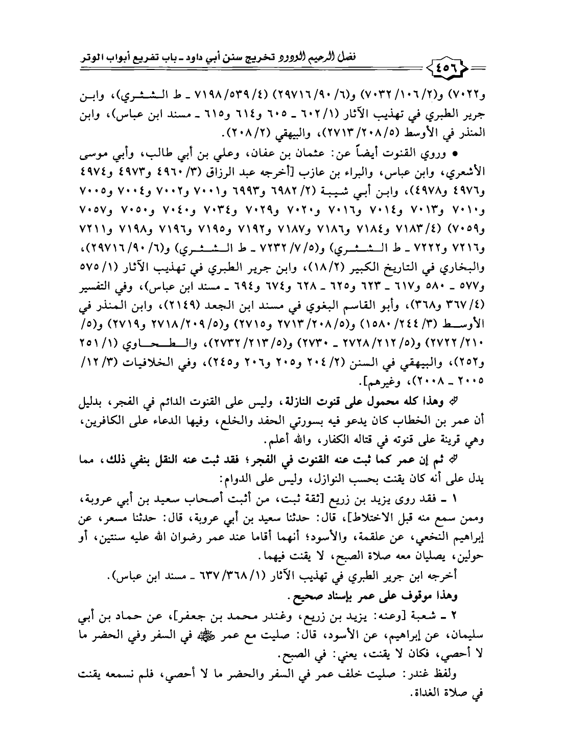 * وروي القنوت أيضًا عن: عثمان بن عفان، وعلي بن أبي طالب، وأبي موسى الأشعري، وابن عباس، والبراء بن عازب [أخرجه عبد الرزاق (٣/ ٤٩٦٠ و ٤٩٧٣ و ٤٩٧٤ و ٤٩٧٦ و ٤٩٧٨)، وابن أبي شيبة (٢/ ٦٩٨٢ و ٦٩٩٣ و ٧٠٠١ و ٧٠٠٢ و ٧٠٠٤ و ٧٠٠٥ و ٧٠١٠ و ٧٠١٣ و ٧٠١٤ و ١٦ ٧٠ و ٧٠٢٠ و ٧٠٢٩ و ٧٠٣٤ و ٧٠٤٠ و ٧٠٥٠ و ٧٠٥٧ و ٧٠٥٩) (٤/ ٧١٨٣ و ٧١٨٤ و ٧١٨٦ و ٧١٨٧ و ٧١٩٢ و ٧١٩٥ و ٧١٩٦ و ٧١٩٨ و ٧٢١١ و ٧٢١٦ و ٧٢٢٢ - ط الشثري) و (٧/ ٥/ ٧٢٣٢ - ط الشثري) و (٦/ ٩٠/ ٢٩٧١٦)، والبخاري في التاريخ الكبير (٢/ ١٨)، وابن جرير الطبري في تهذيب الآثار (١/ ٥٧٥ و ٥٧٧ - ٥٨٠ و ٦١٧ - ٦٢٣ و ٦٢٥ - ٦٢٨ و ٦٧٤ و ٦٩٤ - مسند ابن عباس)، وفي التفسير (٤/ ٣٦٧ و ٣٦٨)، وأبو القاسم البغوي في مسند ابن الجعد (٢١٤٩)، وابن المنذر في الأوسط (٣/ ٢٤٤/ ١٥٨٠) و (٥/ ٢٠٨/ ٢٧١٣ و ٢٧١٥) و (٥/ ٢٠٩/ ٢٧١٨ و ٢٧١٩) و (٥/ ٢١٠/ ٢٧٢٢) و (٥/ ٢١٢/ ٢٧٢٨ - ٢٧٣٠) و (٥/ ٢١٣/ ٢٧٣٢)، والطحاوي (١/ ٢٥١ و ٢٥٢)، والبيهقي في السنن (٢/ ٢٠٤ و ٢٠٥ و ٢٠٦ و ٢٤٥)، وفي الخلافيات (٣/ ١٢/ ٢٠٥٥ - ٢٠٠٨)، وغيرهم].