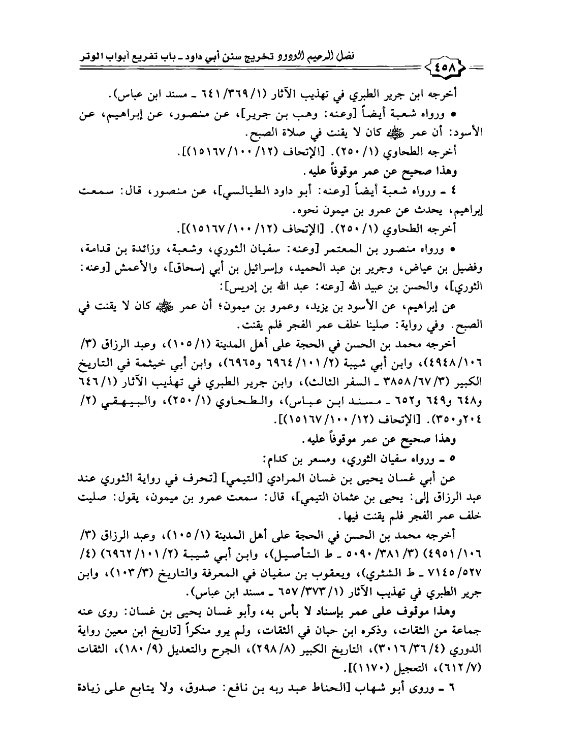 عن أبي غسان يحيى بن غسان المرادي [التيمي] [تحرف في رواية الثوري عند عبد الرزاق إلى: يحيى بن عثمان التيمي]، قال: سمعت عمرو بن ميمون، يقول: صليت خلف عمر الفجر فلم يقنت فيها.