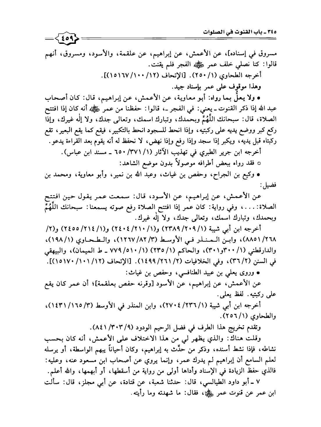 * ولا يعلُّ بما رواه: أبو معاوية، عن الأعمش، عن إبراهيم، قال: كان أصحاب عبد اللّه إذا ذكر القنوت -يعني: في الفجر-، قالوا: حفظنا من عمر - رضي الله عنه - أنه كان إذا افتتح الصلاة، قال: سبحانك اللَّهُمَّ وبحمدك، وتبارك اسمك، وتعالى جدك، ولا إله غيرك، وإذا ركع كبر ووضع يديه على ركبتيه، وإذا انحط للسجود انحط بالتكبير، فيقع كما يقع البعير، تقع ركبتاه قبل يديه، ويكبر إذا سجد وإذا رفع وإذا نهض، لا نحفظ له أنه يقوم بعد القراءة يدعو.