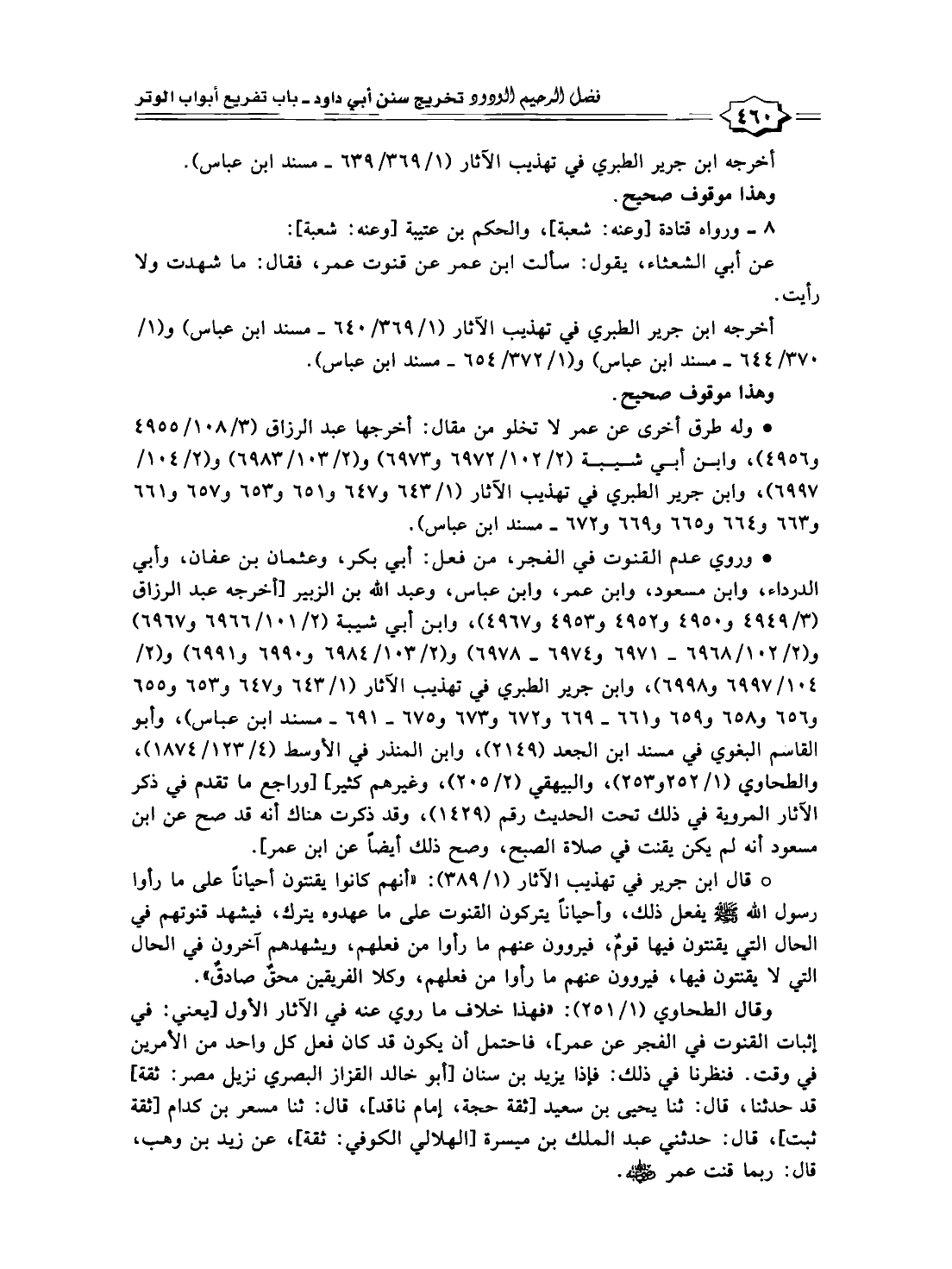 * قال ابن جرير في تهذيب الآثار (١/ ٣٨٩): "أنهم كانوا يقنتون أحيانًا على ما رأوا رسول الله - صلى الله عليه وسلم - يفعل ذلك، وأحيانًا يتركون القنوت على ما عهدوه يترك، فيشهد قنوتهم في الحال التي يقنتون فيها قومٌ، فيروون عنهم ما رأوا من فعلهم، ويشهدهم آخرون في الحال التي لا يقنتون فيها، فيروون عنهم ما رأوا من فعلهم، وكلا الفريقين محقٌ صادقٌ".