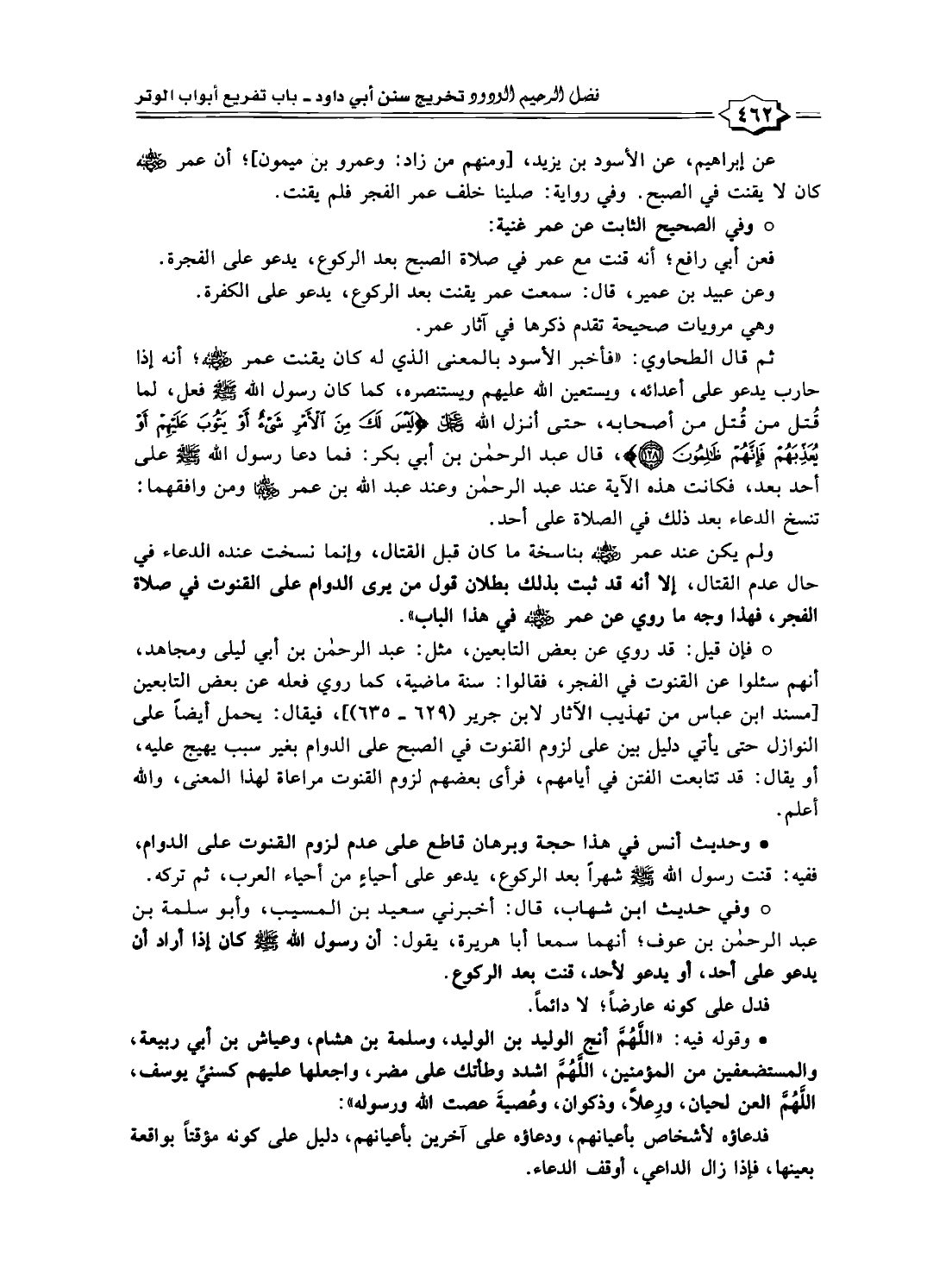 عن إبراهيم، عن الأسود بن يزيد، [ومنهم من زاد: وعمرو بن ميمون]؛ أن عمر - رضي الله عنه - كان لا يقنت في الصبح. وفي رواية: صلينا خلف عمر الفجر فلم يقنت.