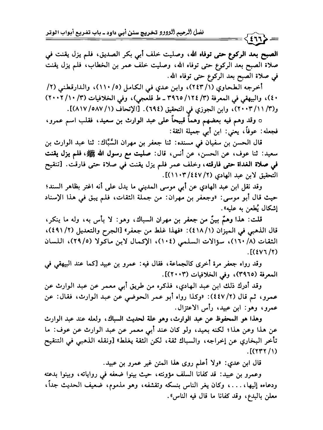 قال الحسن بن سفيان في مسنده: ثنا جعفر بن مهران السَّبَّاك: ثنا عبد الوارث بن سعيد: ثنا عوف، عن الحسن، عن أنس، قال: صليت مع رسول الله - صلى الله عليه وسلم -، فلم يزل يقنت في صلاة الغداة حتى فارقته، وخلف عمر فلم يزل يقنت في صلاة حتى فارقت. [تنقيح التحقيق لابن عبد الهادي (٢/ ٤٤٧/ ١١٠٣)].