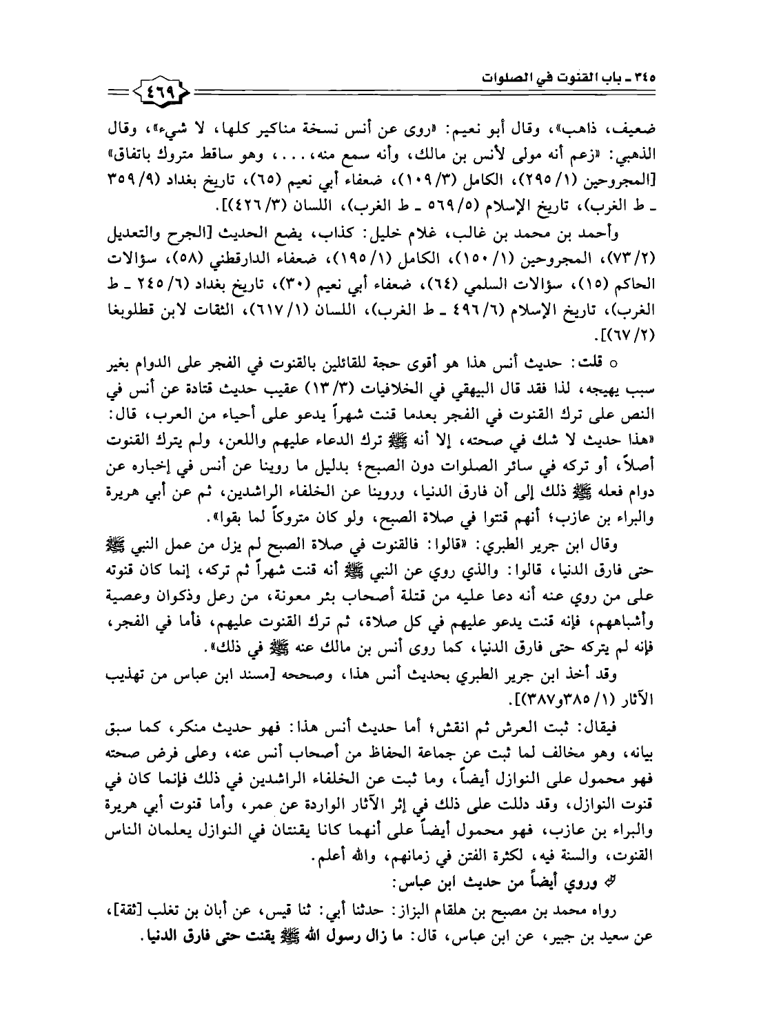 فيقال: ثبت العرش ثم انقش؛ أما حديث أنس هذا: فهو حديث منكر، كما سبق بيانه، وهو مخالف لما ثبت عن جماعة الحفاظ من أصحاب أنس عنه، وعلى فرض صحته فهو محمول على النوازل أيضًا، وما ثبت عن الخلفاء الراشدين في ذلك فإنما كان في قنوت النوازل، وقد دللت على ذلك في إثر الآثار الواردة عن عمر، وأما قنوت أبي هريرة والبراء بن عازب، فهو محمول أيضًا على أنهما كانا يقنتان في النوازل يعلمان الناس القنوت، والسنة فيه، لكثرة الفتن في زمانهم، والله أعلم.