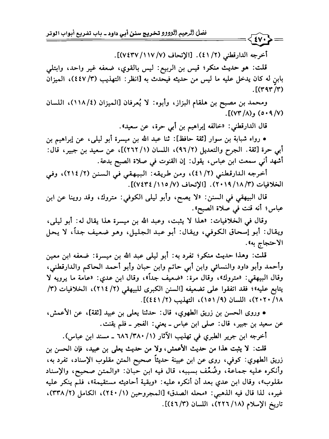 قال البيهقيّ في السنن: "لا يصح، وأبو ليلى الكوفي: متروك، وقد روينا عن ابن عباس؛ أنه قنت في صلاة الصبح".