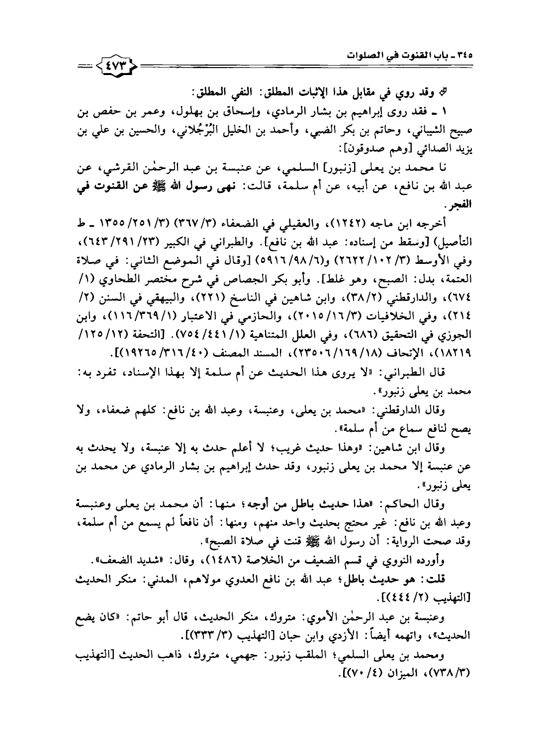 وقال الحاكم: "هذا حديث باطل من أوجه؛ منها: أن محمد بن يعلى وعنبسة وعبد اللّه بن نافع: غير محتج بحديث واحد منهم، ومنها: أن نافعًا لم يسمع من أم سلمة، وقد صحت الرواية: أن رسول اللّه - صلى الله عليه وسلم - قنت في صلاة الصبح".