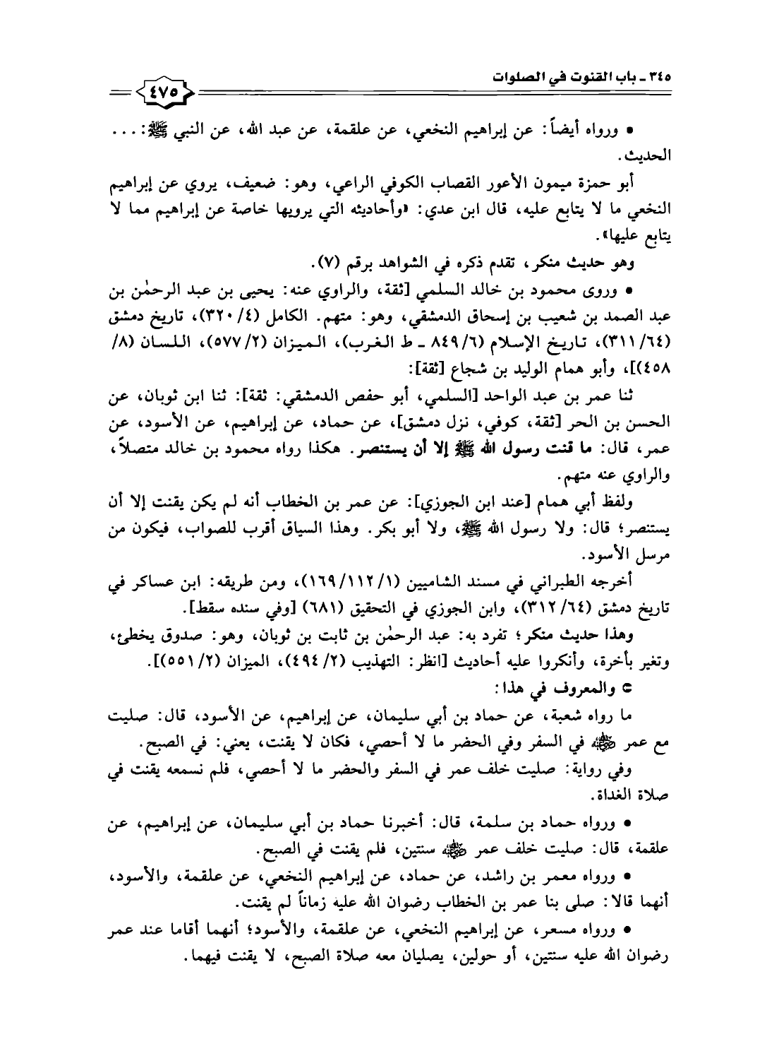 ثنا عمر بن عبد الواحد [السلمي، أبو حفص الدمشقي: ثقة]: ثنا ابن ثوبان، عن الحسن بن الحر [ثقة، كوفي، نزل دمشق]، عن حماد، عن إبراهيم، عن الأسود، عن عمر، قال: ما قنت رسول الله - صلى الله عليه وسلم - إِلَّا أن يستنصر. هكذا رواه محمود بن خالد متصلًا، والراوي عنه متهم.