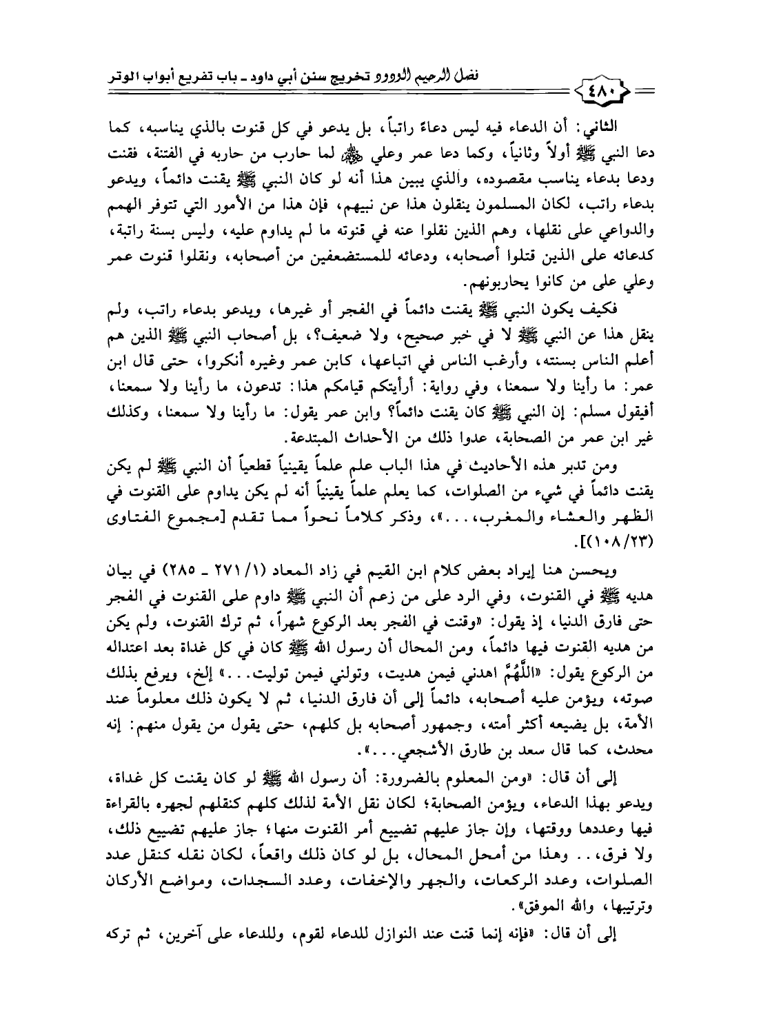 الثاني: أن الدعاء فيه ليس دعاءً راتبًا، بل يدعو في كل قنوت بالذي يناسبه، كما دعا النَّبِيّ - صلى الله عليه وسلم - أولًا وثانيًا، وكما دعا عمر وعلي - رضي الله عنه - لما حارب من حاربه في الفتنة، فقنت ودعا بدعاء يناسب مقصوده، وألذي يبين هذا أنه لو كان النَّبِيّ - صلى الله عليه وسلم - يقنت دائمًا، ويدعو بدعاء راتب، لكان المسلمون ينقلون هذا عن نبيهم، فإن هذا من الأمور التي تتوفر الهمم والدواعي على نقلها، وهم الذين نقلوا عنه في قنوته ما لم يداوم عليه، وليس بسنة راتبة، كدعائه على الذين قتلوا أصحابه، ودعائه للمستضعفين من أصحابه، ونقلوا قنوت عمر وعلي على من كانوا يحاربونهم.