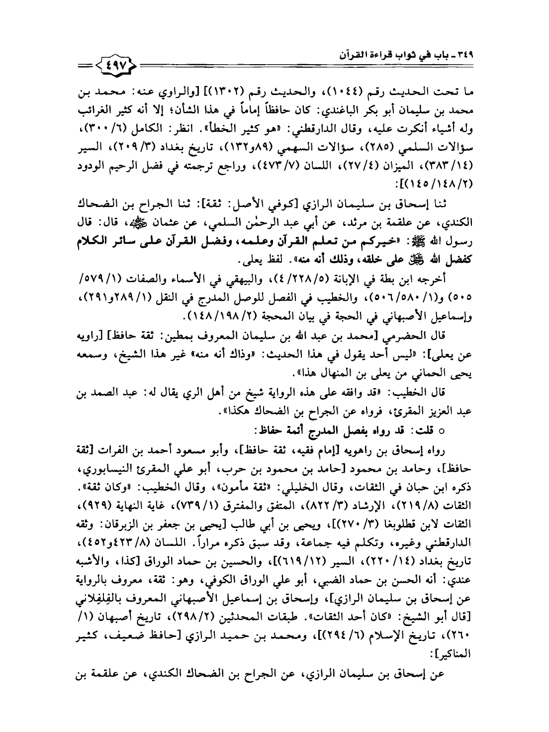 ثنا إسحاق بن سليمان الرازي [كوفي الأصل: ثقة]: ثنا الجراح بن الضحاك الكندي، عن علقمة بن مرثد، عن أبي عبد الرحمن السلمي، عن عثمان - رضي الله عنه -، قال: قال رسول الله - صلى الله عليه وسلم -: "خيركم من تعلم القرآن وعلمه، وفضل القرآن على سائر الكلام كفضل الله - عز وجل - على خلقه، وذلك أنه منه". لفظ يعلى.