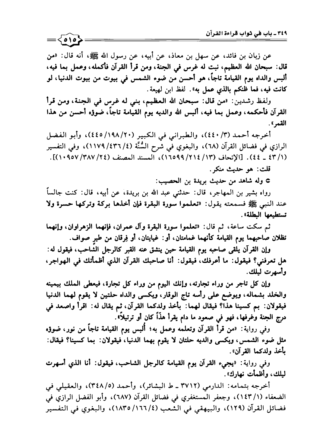 عن زبان بن فائد، عن سهل بن معاذ، عن أبيه، عن رسول الله - صلى الله عليه وسلم -، أنه قال: "من قال: سبحان الله العظيم، نبت له غرس في الجنة، ومن قرأ القرآن فكمله، وعمل بما فيه، ألبس والداه يوم القيامة تاجًا، هو أحسن من ضوء الشمس في بيوت من بيوت الدنيا، لو كانت فيه، فما ظنكم بالذي عمل به". لفظ ابن لهيعة.