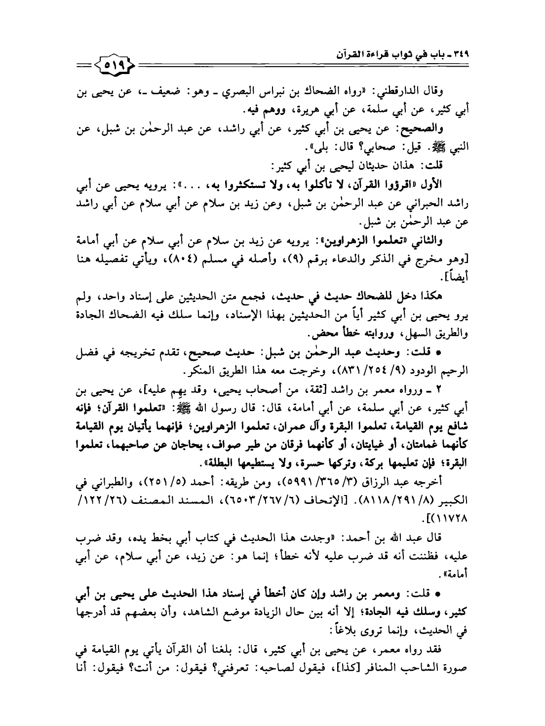 ٢ - ورواه معمر بن راشد [ثقة، من أصحاب يحيى، وقد يهِم عليه]، عن يحيى بن أبي كثير، عن أبي سلمة، عن أبي أمامة، قال: قال رسول الله - صلى الله عليه وسلم -: "تعلموا القرآن؛ فإنه شافع يوم القيامة، تعلموا البقرة وآل عمران، تعلموا الزهراوين؛ فإنهما يأتيان يوم القيامة كأنهما غمامتان، أو غيايتان، أو كأنهما فرقان من طير صواف، يحاجان عن صاحبهما، تعلموا البقرة؛ فإن تعليمها بركة، وتركها حسرة، ولا يستطيعها البطلة".