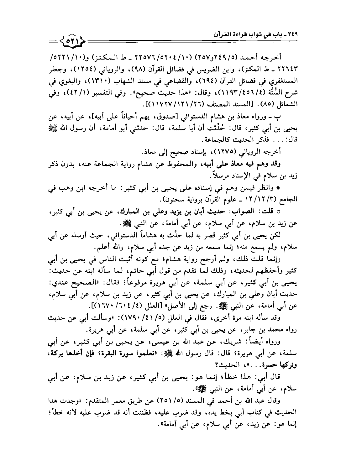 وإنما قلت ذلك، ولم أرجح رواية هشام؛ مع كونه أثبت الناس في يحيى بن أبي كثير وأحفظهم لحديثه، وذلك لما تقدم من قول أبي حاتم، لما سأله ابنه عن حديث: يحيى بن أبي كثير، عن أبي سلمة، عن أبي هريرة مرفوعًا؛ فقال: "الصحيح عندي: حديث أبان وعلي بن المبارك، عن يحيى بن أبي كثير، عن زيد بن سلام، عن أبي سلام، عن أبي أمامة، عن النبي - صلى الله عليه وسلم -. رجع إلى الأصل" [العلل (٤/ ٦٠٤/ ١٦٧٠)].