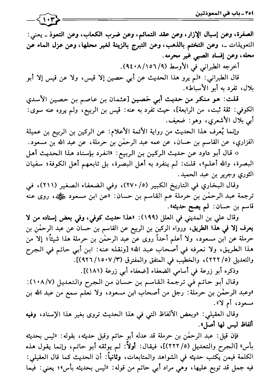 وقال البخاري في التاريخ الكبير (٥/ ٢٧٠)، وفي الضعفاء الصغير (٢١١)، في ترجمة عبد الرحمن بن حرملة عم القاسم بن حسان: "عن ابن مسعود -رضي الله عنه-، روى عنه قاسم بن حسان: لم يصح حديثه".