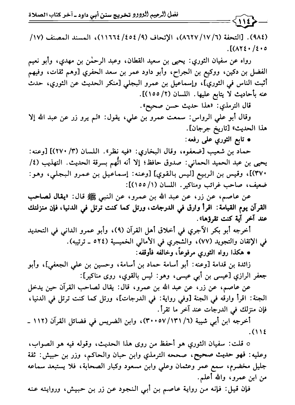 * قلت: سفيان الثوري هو أحفظ من روى هذا الحديث، وقوله فيه هو الصواب، وعليه: فهو حديث صحيح، صححه الترمذي وابن حبان والحاكم، وزر بن حبيش: ثقة جليل مخضرم، سمع عمر وعثمان وعلي وابن مسعود وكبار الصحابة، فلا يستبعد سماعه من ابن عمرو، والله أعلم.