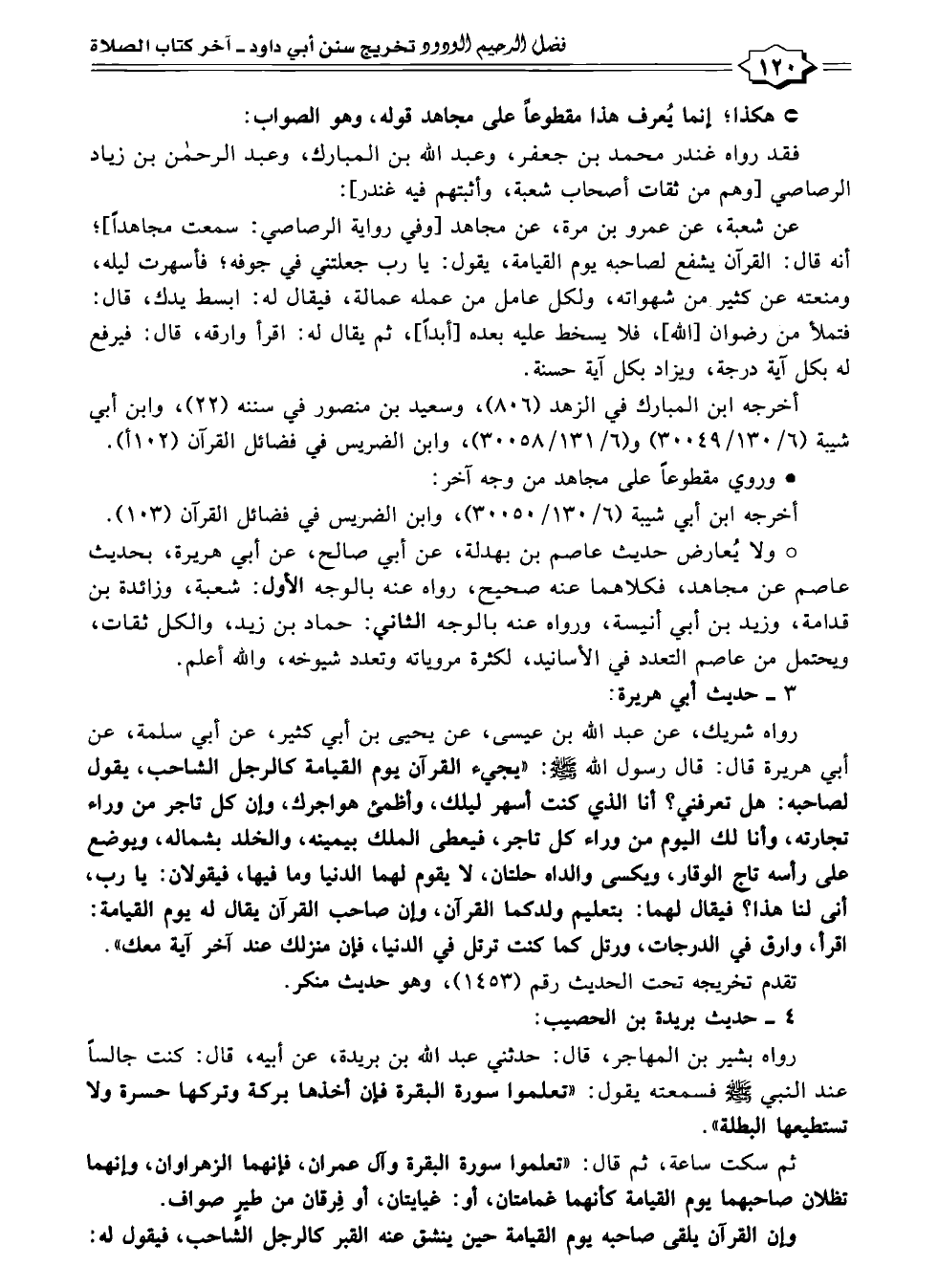 * ولا يُعارض حديث عاصم بن بهدلة، عن أبي صالح، عن أبي هريرة، بحديث عاصم عن مجاهد، فكلاهما عنه صحيح، رواه عنه بالوجه الأول: شعبة، وزائدة بن قدامة، وزيد بن أبي أنيسة، ورواه عنه بالوجه الثاني: حماد بن زيد، والكل ثقات، ويحتمل من عاصم التعدد في الأسانيد، لكثرة مروياته وتعدد شيوخه، والله أعلم.