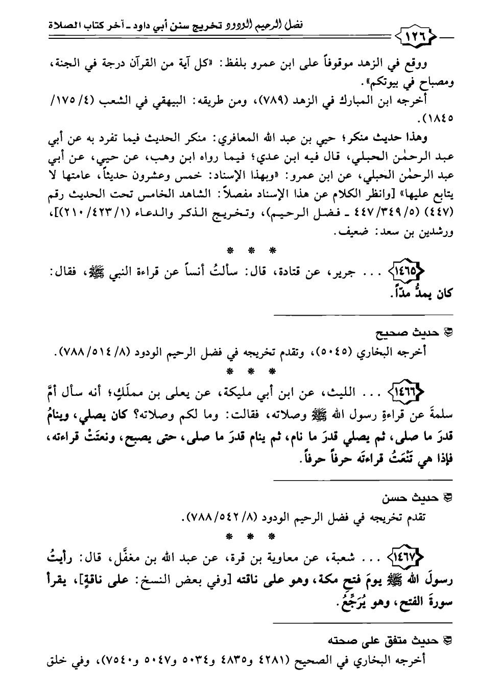 ١٤٦٦ - . . . الليث، عن ابن أبي مليكة، عن يعلى بن مملَكٍ؛ أنه سأل أمَّ سلمةَ عن قراءةِ رسول الله -صلى الله عليه وسلم- وصلاته، فقالت: وما لكم وصلاته؟ كان يصلي، وينامُ قدرَ ما صلى، ثم يصلي قدرَ ما نام، ثم ينام قدرَ ما صلى، حتى يصبح، ونعتَتْ قراءته، فإذا هي تَنْعَتُ قراءتَه حرفًا حرفًا.
