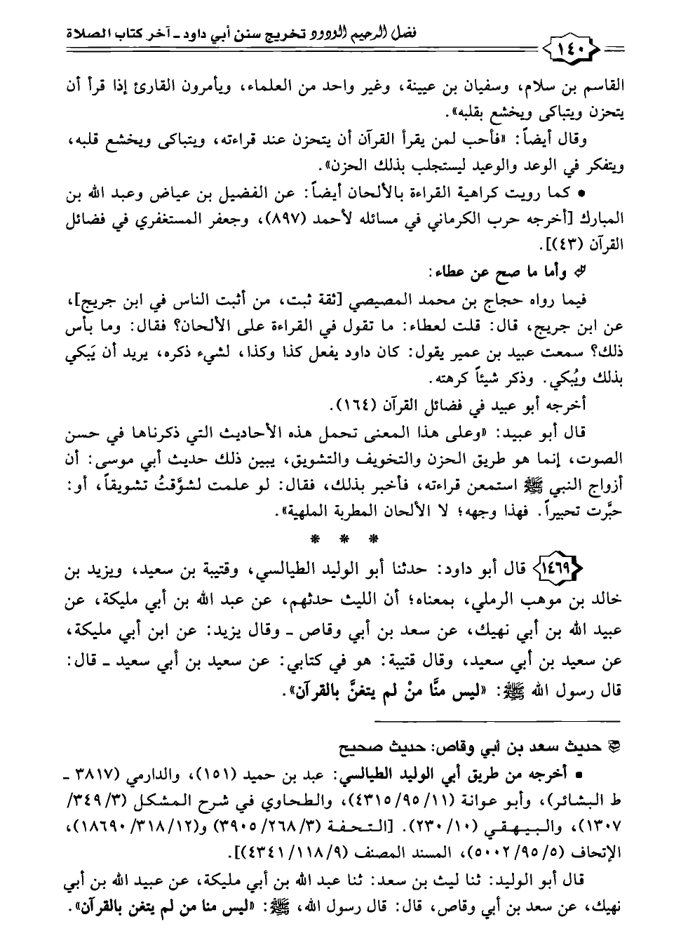 ١٤٦٩ - قال أبو داود: حدثنا أبو الوليد الطيالسي، وقتيبة بن سعيد، ويزيد بن خالد بن موهب الرملي، بمعناه؛ أن الليث حدثهم، عن عبد الله بن أبي مليكة، عن عبيد الله بن أبي نهيك، عن سعد بن أبي وقاص -وقال يزيد: عن ابن أبي مليكة، عن سعيد بن أبي سعيد، وقال قتيبة: هو في كتابي: عن سعيد بن أبي سعيد- قال: قال رسول الله -صلى الله عليه وسلم-: "ليس منَّا منْ لم يتغنَّ بالقرآن".