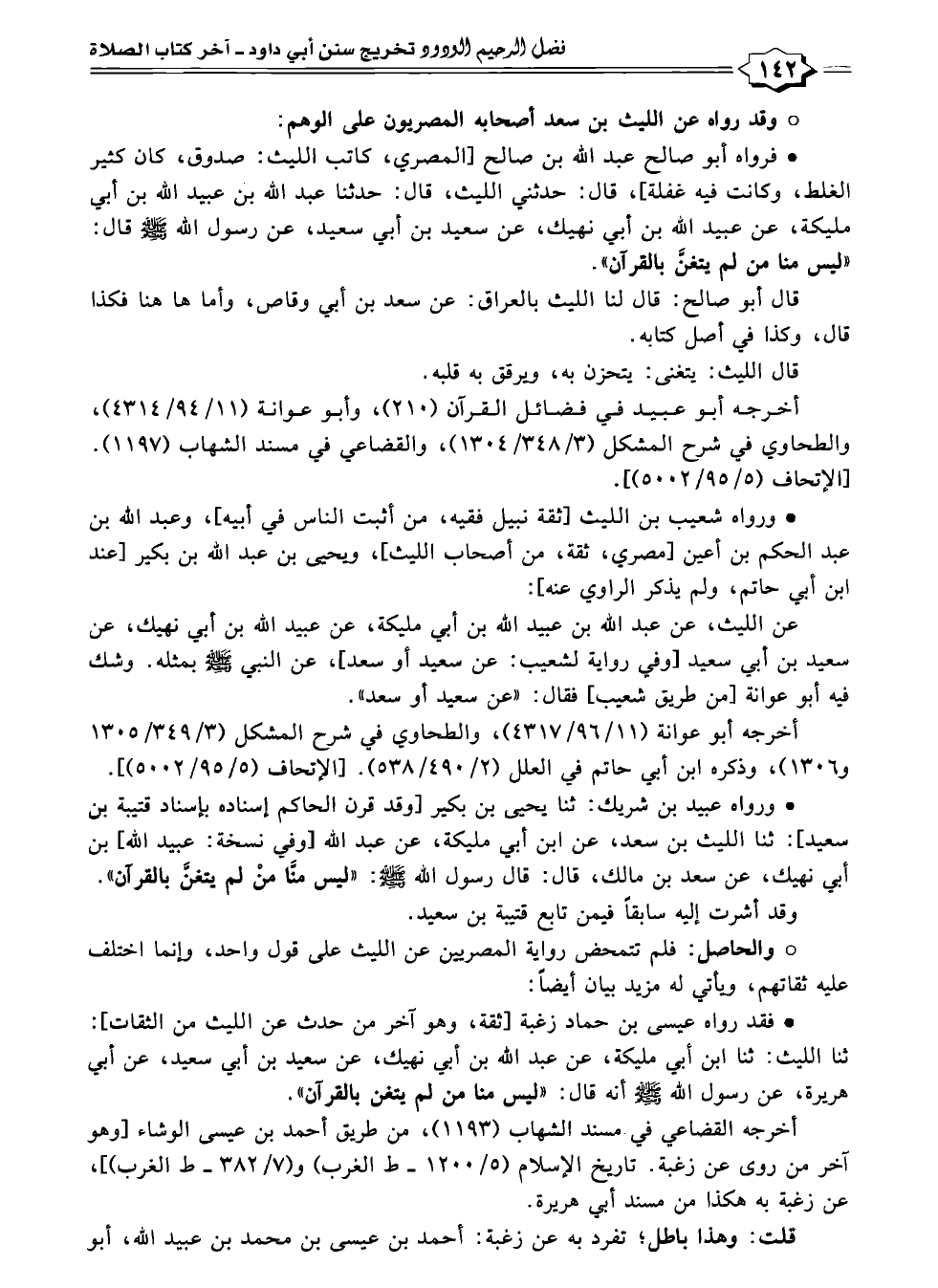 * فقد رواه عيسى بن حماد زغبة [ثقة، وهو آخر من حدث عن الليث من الثقات]: ثنا الليث: ثنا ابن أبي مليكة، عن عبد الله بن أبي نهيك، عن سعيد بن أبي سعيد، عن أبي هريرة، عن رسول الله -صلى الله عليه وسلم- أنه قال: "ليس منا من لم يتغن بالقرآن".