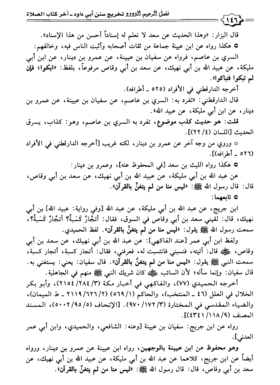 ابن جريج، عن عبد الله بن أبي مليكة، عن عبد الله [وفي رواية: عبيد الله] بن أبي نهيك، قال: لقيني سعد بن أبي وقاص في السوق، فقال: أتجَّارٌ كَسَبةٌ؟ أتجَّارٌ كَسَبةٌ؟، سمعت رسول الله -صلى الله عليه وسلم- يقول: "ليس منا من لم يتغنَّ بالقرآن". لفظ الحميدي.