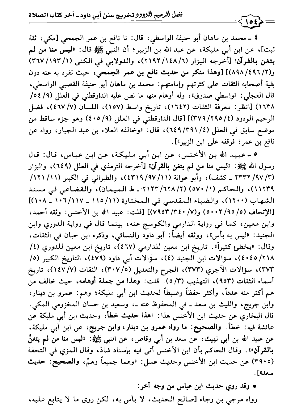 ٤ - محمد بن ماهان أبو حنيفة الواسطي، قال: نا نافع بن عمر الجمحي [مكي، ثقة ثبت]، عن ابن أبي مليكة، عن عبد الله بن الزبير؛ أن النبي -صلى الله عليه وسلم- قال: "ليس منا من لم يتغن بالقرآن" [أخرجه البزار (٦/ ١٤٨/ ٢١٩٢)، والدولابي في الكنى (١/ ١٩٣/ ٣٦٧) و (٢/ ٤٩٦/ ٨٩٨)] [وهذا منكر من حديث نافع بن عمر الجمحي، حيث تفرد به عنه دون بقية أصحابه الثقات على كثرتهم وإمامتهم: محمد بن ماهان أبو حنيفة القصبي الواسطي، قال العجلي: "واسطي صدوق"، وله أوهام منها ما نص عليه الدارقطني في العلل ٩١/ ٥٤/ ١٦٣٨) [انظر: معرفة الثقات (١٦٤٢)، تاريخ واسط (١٥٧)، اللسان (٧/ ٤٦٧)، فضل الرحيم الودود (٤/ ٢٩٥/ ٣٧٩)] [قال الدارقطني في العلل (٩/ ٤٠٥) وهو جزء ساقط من موضع سابق في العلل (٤/ ٦٤٩/٣٩١)، قال: "وخالفه العلاء بن عبد الجبار، رواه عن نافع بن عمر؛ فوقفه على ابن الزبير"].