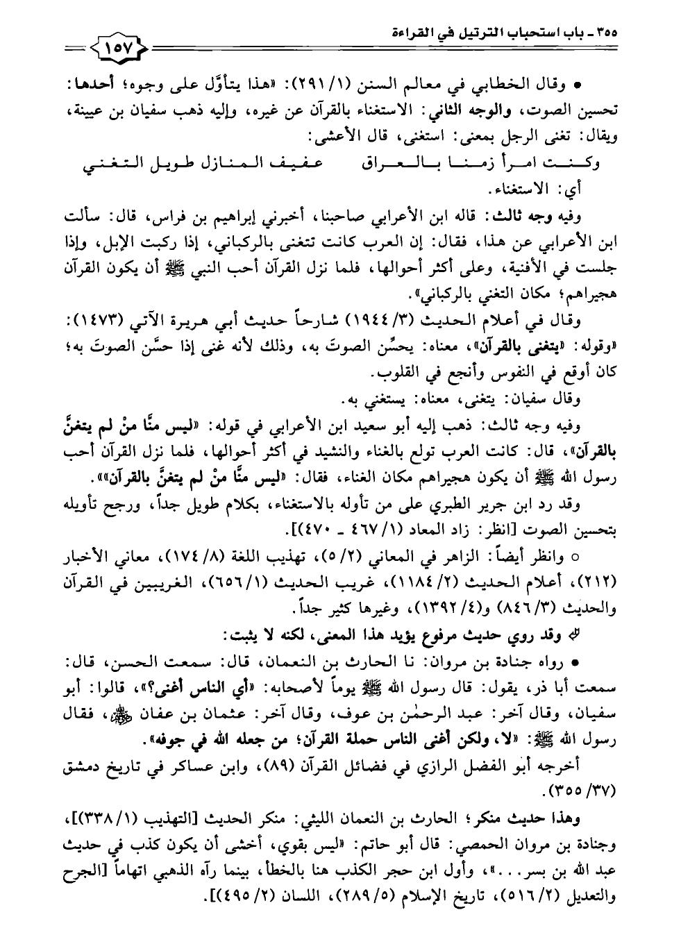 وقال في أعلام الحديث (٣/ ١٩٤٤) شارحًا حديث أبي هريرة الآتي (١٤٧٣): "وقوله: "يتغنى بالقرآن"، معناه: يحسِّن الصوتَ به، وذلك لأنه غنى إذا حسَّن الصوتَ به؛ كان أوقع في النفوس وأنجع في القلوب.