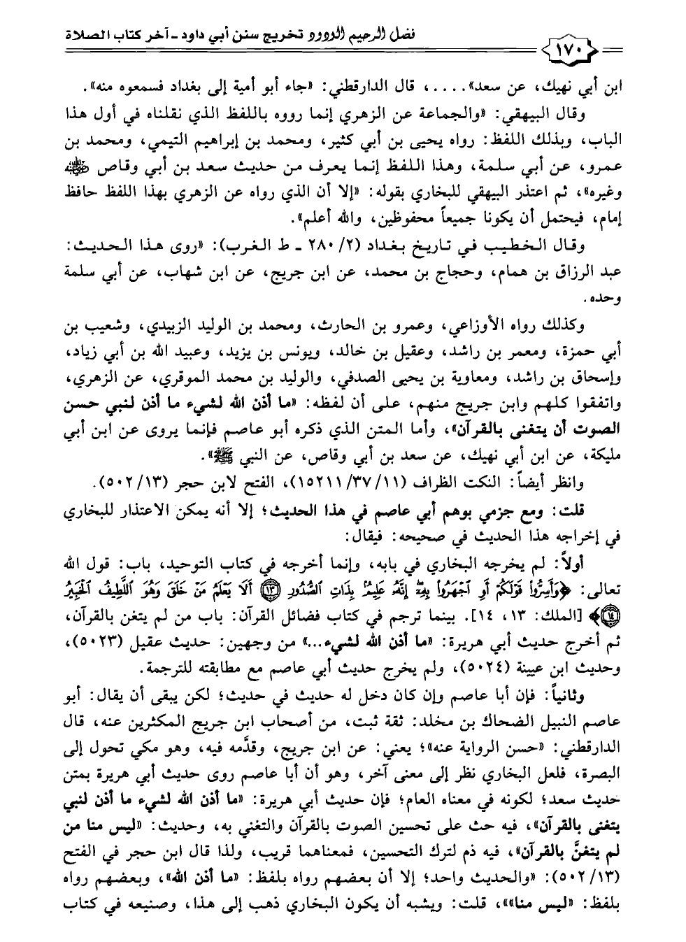 وكذلك رواه الأوزاعي، وعمرو بن الحارث، ومحمد بن الوليد الزبيدي، وشعيب بن أبي حمزة، ومعمر بن راشد، وعقيل بن خالد، ويونس بن يزيد، وعبيد الله بن أبي زياد، وإسحاق بن راشد، ومعاوية بن يحيى الصدفي، والوليد بن محمد الموقري، عن الزهري، واتفقوا كلهم وابن جريج منهم، على أن لفظه: "ما أذن الله لشيء ما أذن لنبي حسن الصوت أن يتغنى بالقرآن"، وأما المتن الذي ذكره أبو عاصم فإنما يروى عن ابن أبي مليكة، عن ابن أبي نهيك، عن سعد بن أبي وقاص، عن النبي - صلى الله عليه وسلم - ".